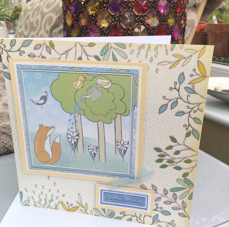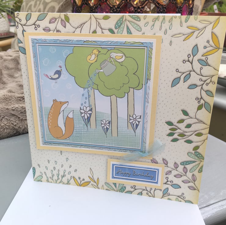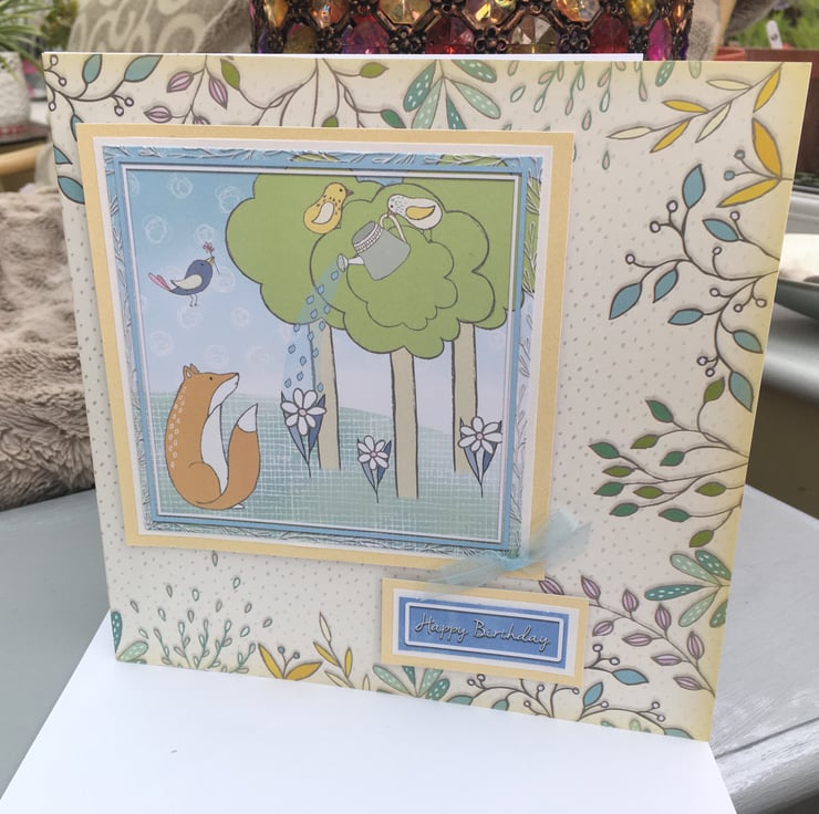 A little whimsey to celebrate a birthday, how lovely. A few forest friends to cheer anyones day, a curious fox and all is friends adorn this delicate card. A little bird waters the flowers as Mr Fox looks on. Pale shades make this a calm and peaceful design.