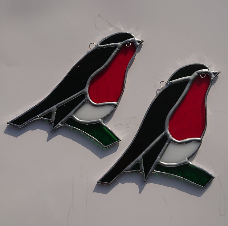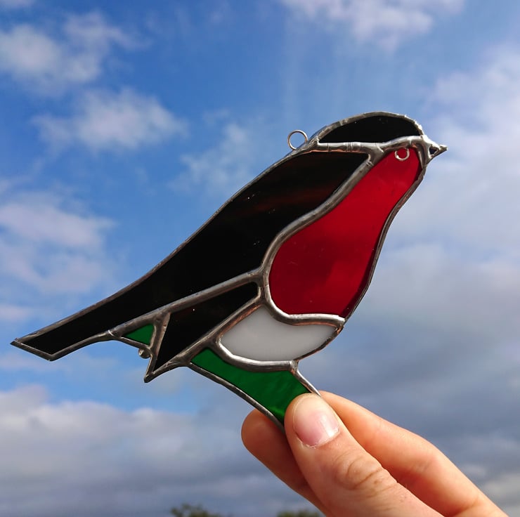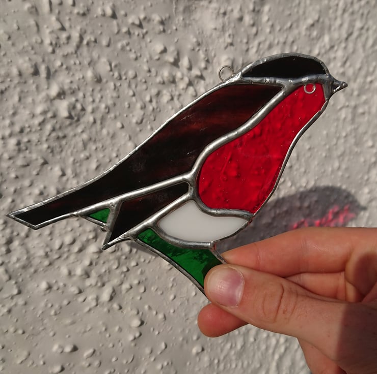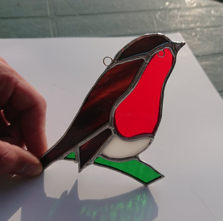 This robin's breast has been cut from a vivid red glass giving a gentle textured effect. The back and wing are from a graduated brown and clear giving different strengths of colour with a white underbelly. The branch is a translucent green with and a purple beak finishes the piece.