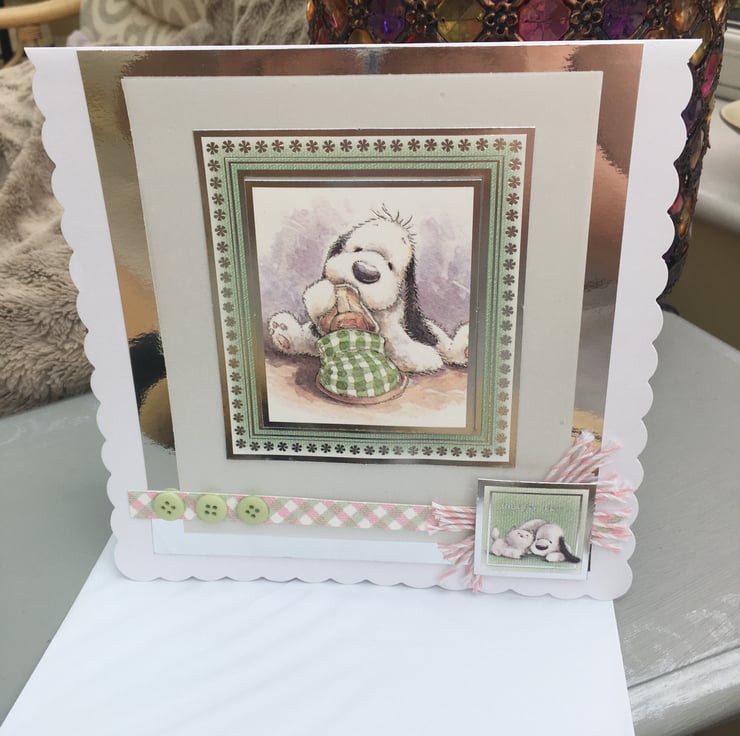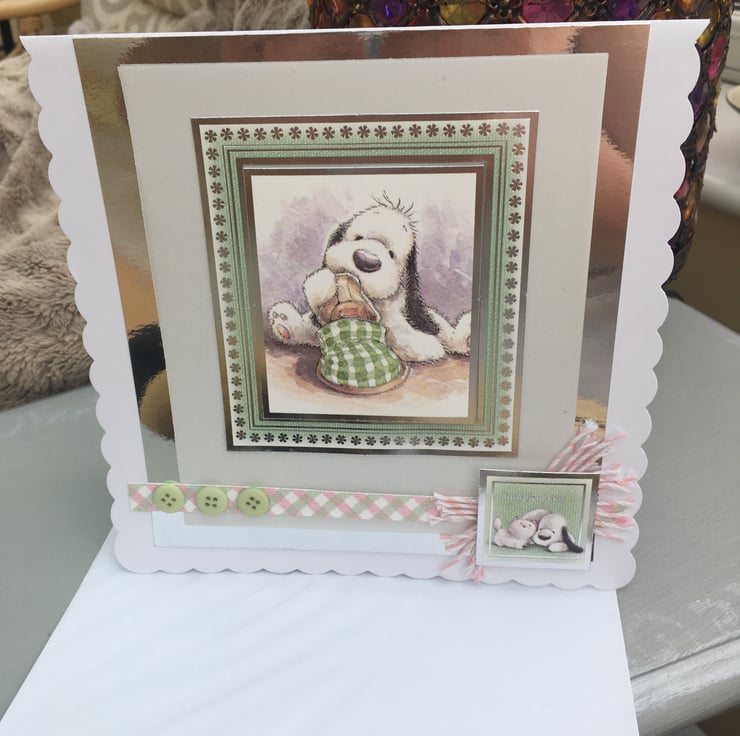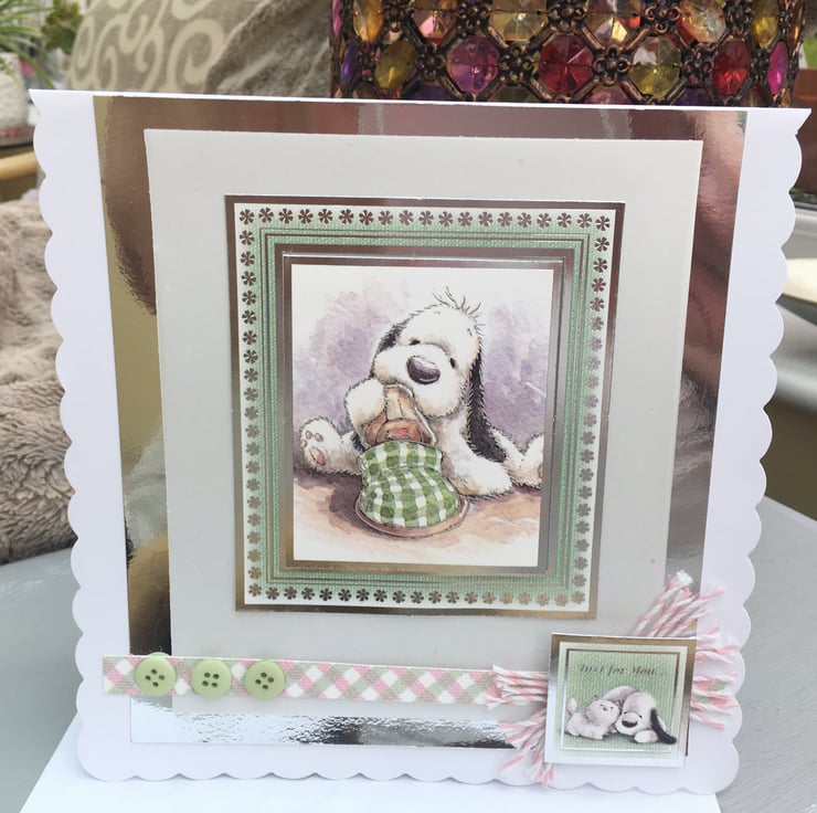 The scalloped 8x8inch card features an adorable pup chewing a slipper, it is mounted on white lightly sparkled vellum and silver mirror card. the card is finished with gingham green and pink card, green buttons, bakers twine and a 'Just for you' greeting. Inside has a pink and silver paw print strip and a with love greeting in silver.