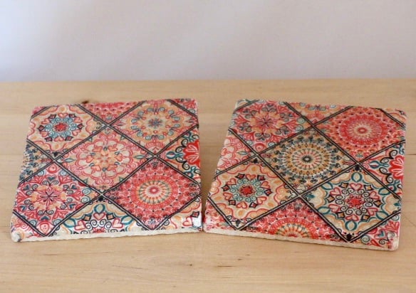 A pair of marble coasters measuring 10cm square decoupaged with paper napkins in a peach/orange tile pattern. They have been coated with a matt lacquer so they can be wiped with a damp cloth (do not immerse in water) and have four plastic feet on the base to protect your furniture. Please note that as this item will be made to order, and due to the fact that every stone is unique, the colour and design may vary slightly from that illustrated.