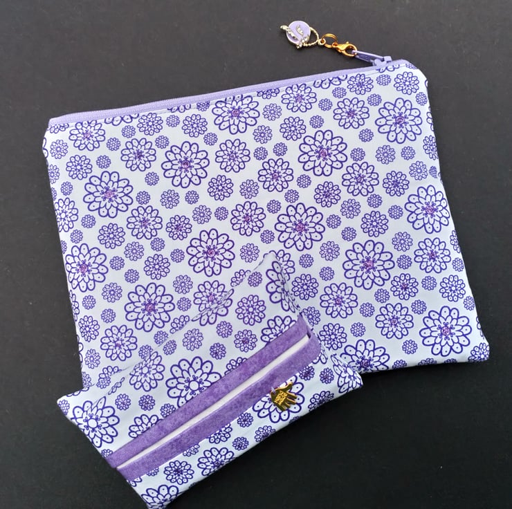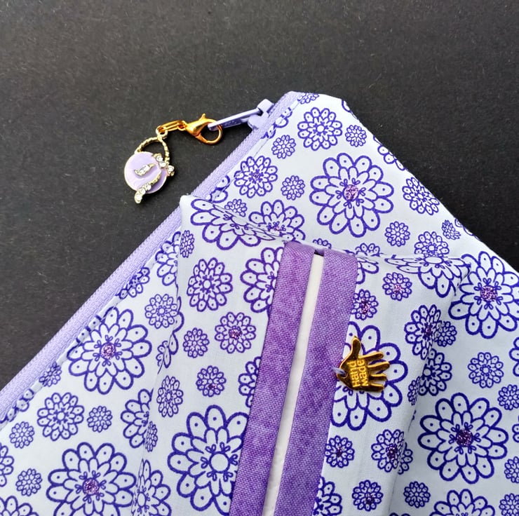 The bag is 15x19cm, wadded and lined in cotton. Some glitter dots add interest to the front, and it has a purple glitter bag charm that can be detached and clipped onto something else