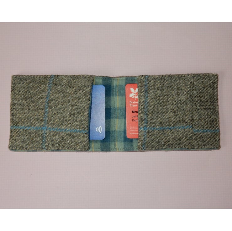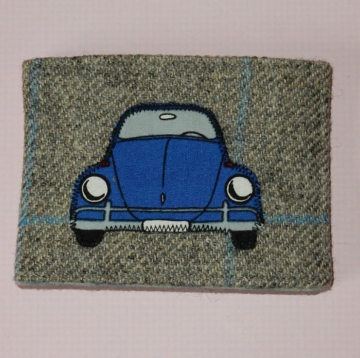 Made from tweed this card wallet is smart and hardwearing. It is made from a woollen tweed, with a beetle car (made from cotton) appliqued on. The handmade wallet is ideal for travel cards, Oyster cards, bus pass or even credit cards. It measures approx. 3.5 x 3 inches folded and 7.5 inches open. It is interfaced and lined with toning brushed cotton fabric. It would make an ideal gift for a man.