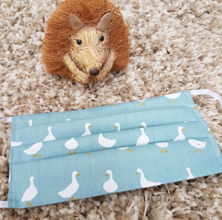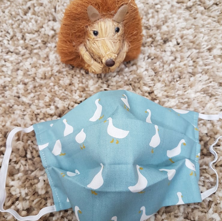 Small Adult/Teenager face covering made from a duck print on duck-egg blue cotton. The face mask is made with 2 layers of cotton forming an inner pocket for a filter (not included) and is fastened over the ears with 2 loops of elastic and a toggle adjuster.