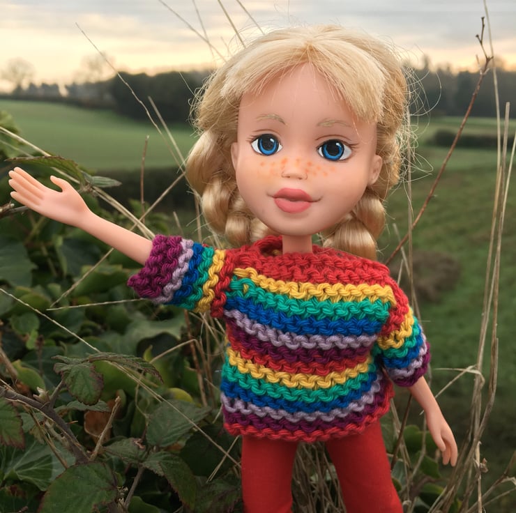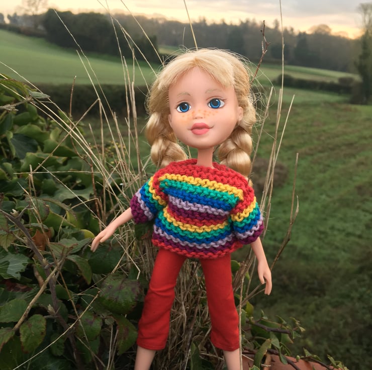 Joy has enjoyed a thorough spa treatment and had her hair detangled, washed and trimmed. After cleaning and sterilising a new face has been repainted on by hand using non toxic paints and sealed to give her a fresh, natural look. Joy has a cute outfit, a hand knitted rainbow jumper and matching red trousers and pop on and off shoes hand sculpted from silicone.