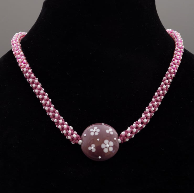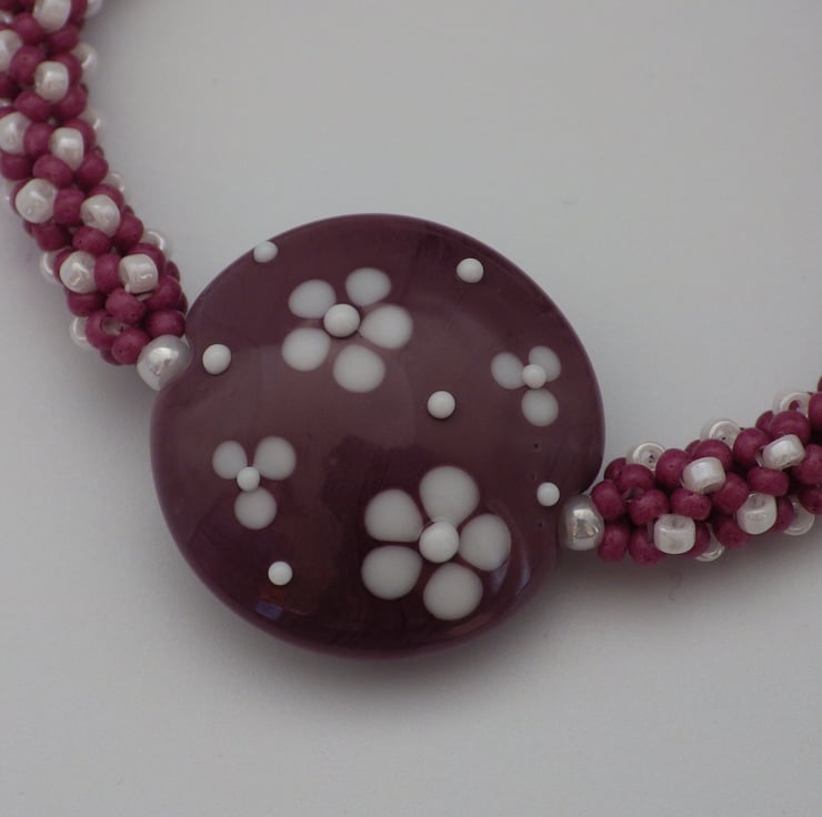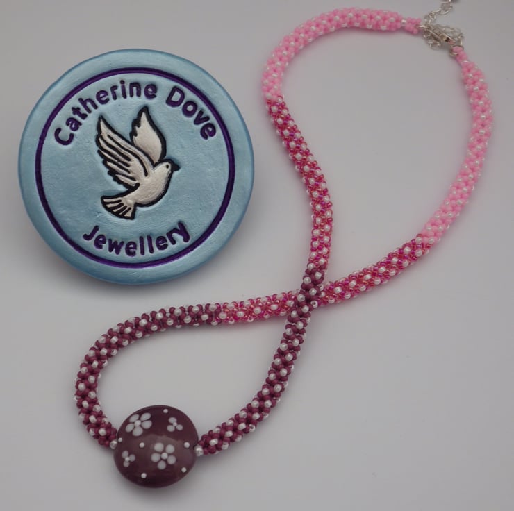 This bead is centred on a purple lentil bead handmade in the UK with lampwork glass. It has a gentle shine and features white flowers and raised spots, which give texture to the bead. I’ve chosen to enhance these spots by fixing the bead on a lovely fluid chenille stitch beadwoven rope, with beads fading through from purple to pink and with a spotty white pattern throughout. The rope is made using quality glass Japanese seed beads and are a mixture of matte and shiny finishes. The rope is finished with Sterling Silver findings, including a lobster clasp and extension chain.