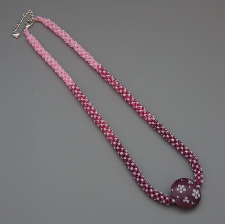 This bead is centred on a purple lentil bead handmade in the UK with lampwork glass. It has a gentle shine and features white flowers and raised spots, which give texture to the bead. I’ve chosen to enhance these spots by fixing the bead on a lovely fluid chenille stitch beadwoven rope, with beads fading through from purple to pink and with a spotty white pattern throughout. The rope is made using quality glass Japanese seed beads and are a mixture of matte and shiny finishes. The rope is finished with Sterling Silver findings, including a lobster clasp and extension chain.