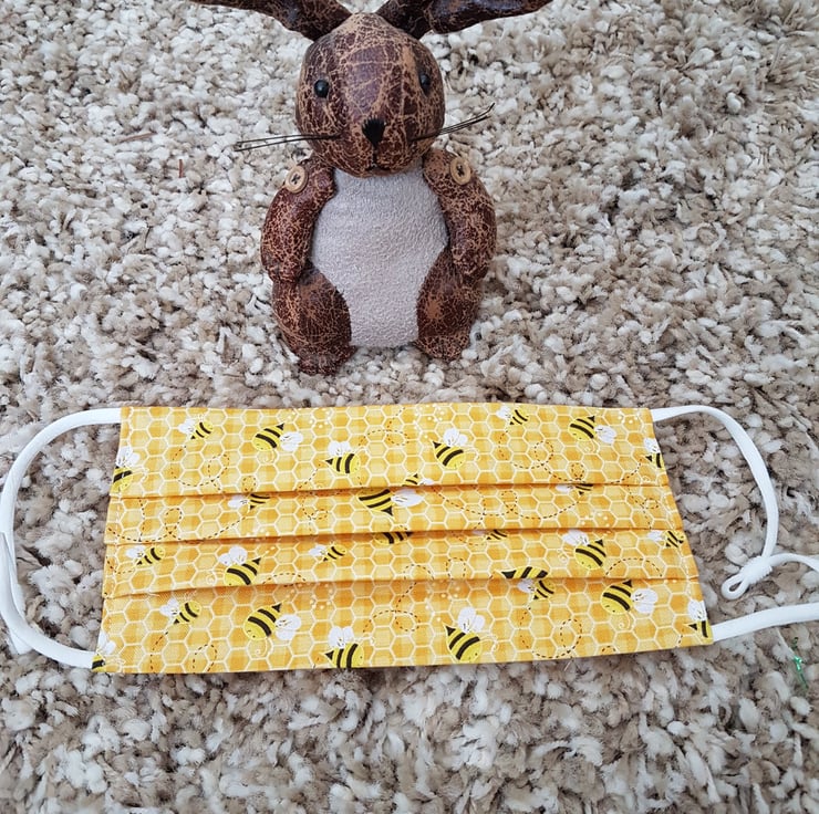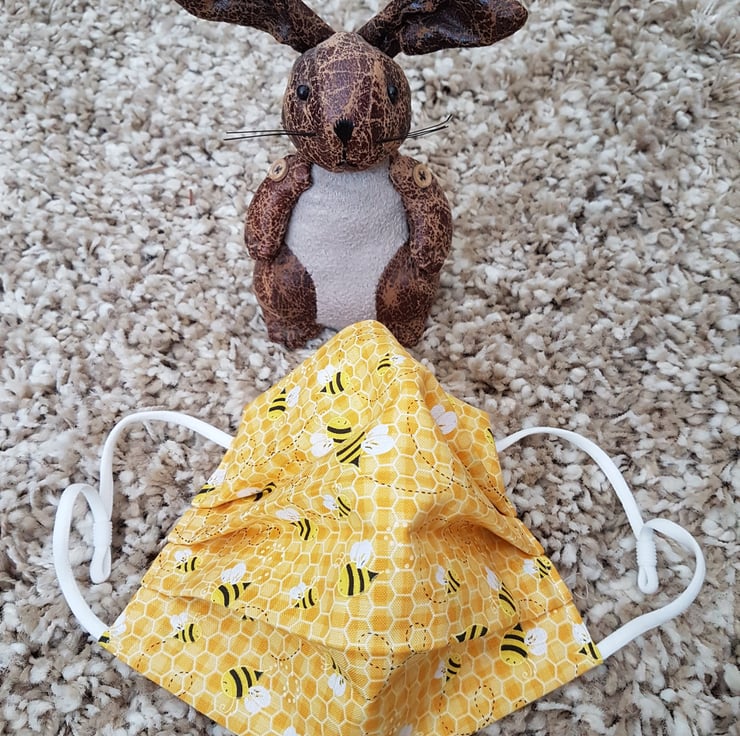 Adult face covering/mask made from a yellow bumble bee print. The face mask is made with 2 layers of cotton forming an inner pocket for a filter (not included) and is fastened over the ears with 2 loops of elastic and a toggle adjuster.