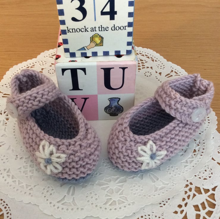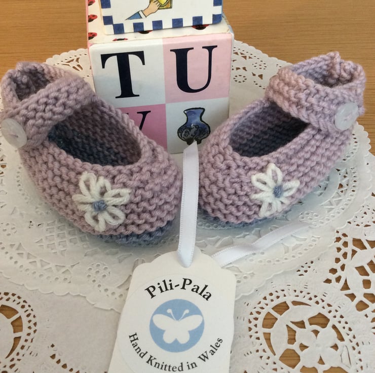 These soft little shoes are hand knitted by me. They are knitted in a cashmere blend wool that is soft for babies feet but can also be machine washed at 30 degrees.