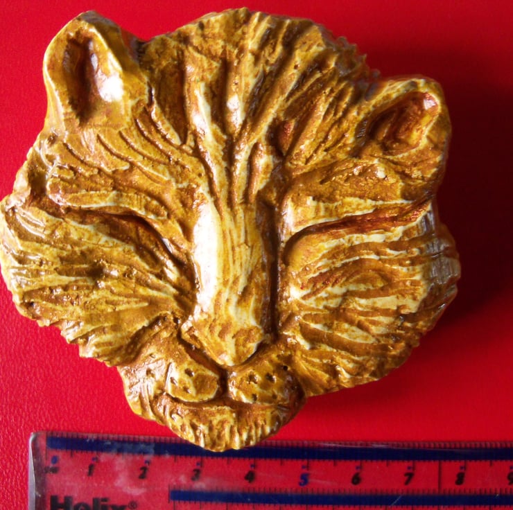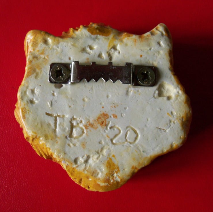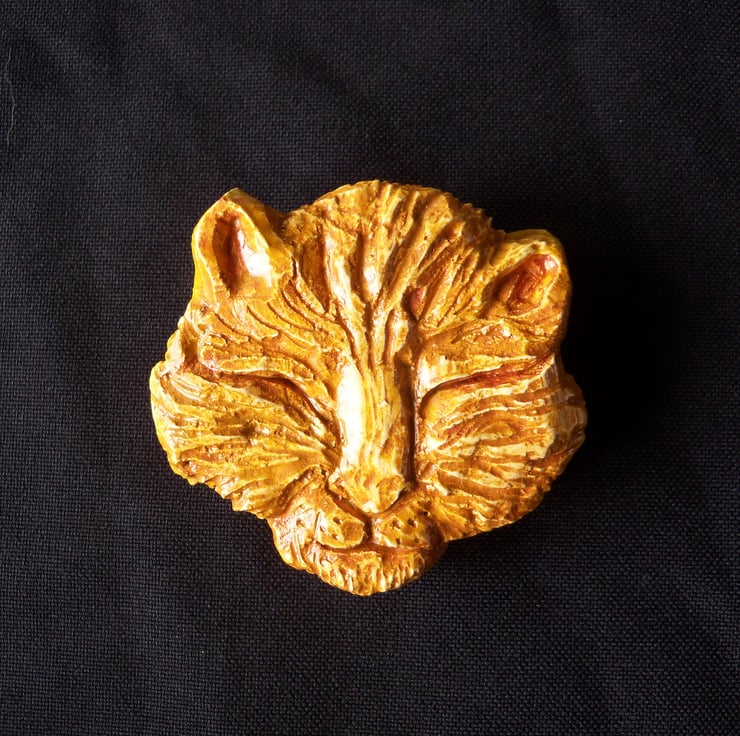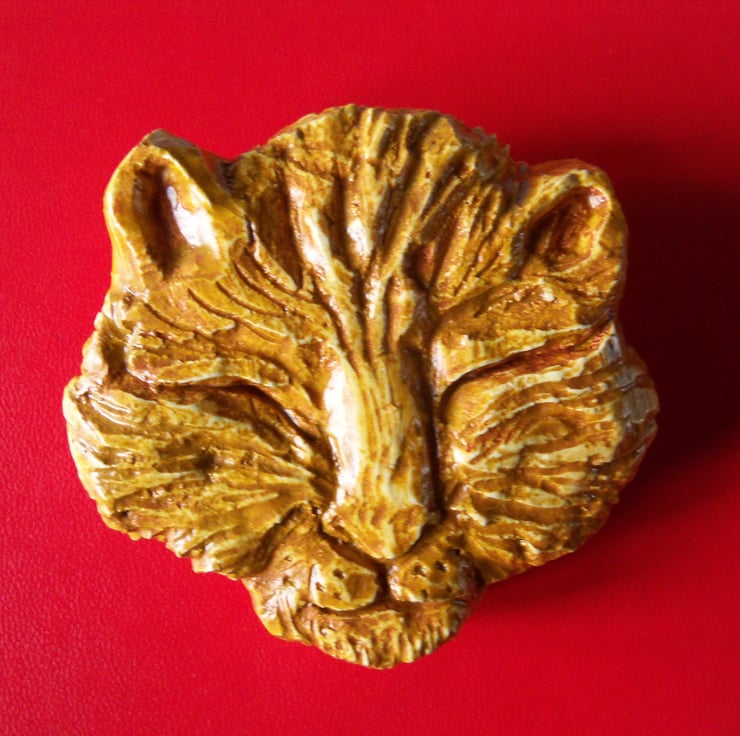 A cat's head, eyes closed in a sleepy blink, hand-carved from a small block of plaster of Paris, then painted in yellow and orange acrylic, coated with a water-based varnish, and finally a layer of yacht varnish. There's a saw tooth picture hanger fitted at the back so the carving can be hung on a nail or a hook. The varnish means it can be hung out of doors if required. Like all Tom Bloor's carvings, this is a unique, one-off piece. SIze: 8 c.m. x 7 c.m. (2 c.m. deep) approx.