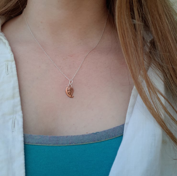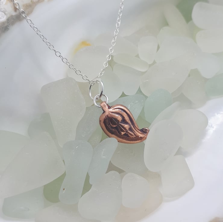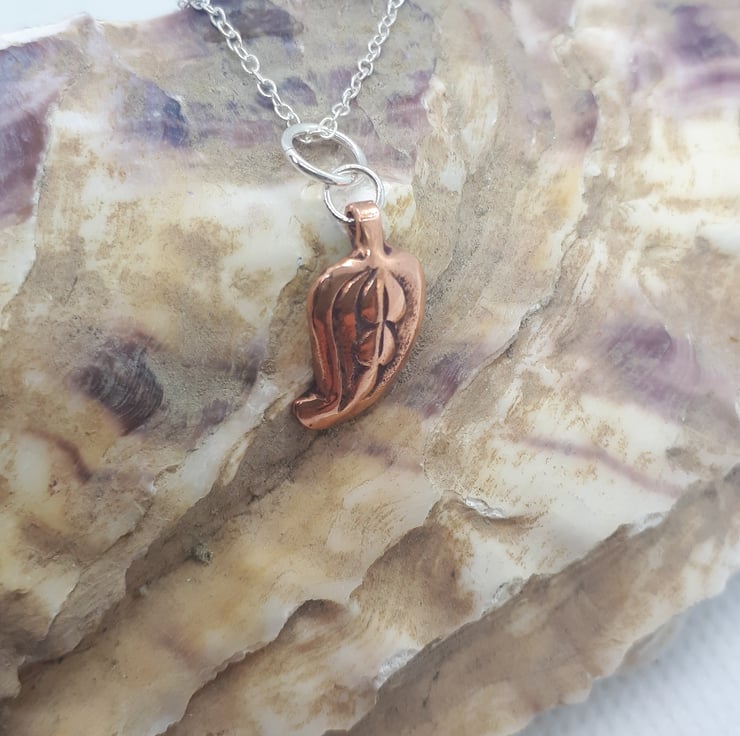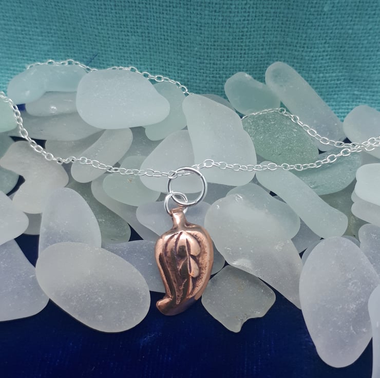 A copper leaf with the reverse filled with apple green glass enamel, hung on a sterling silver trace chain.
