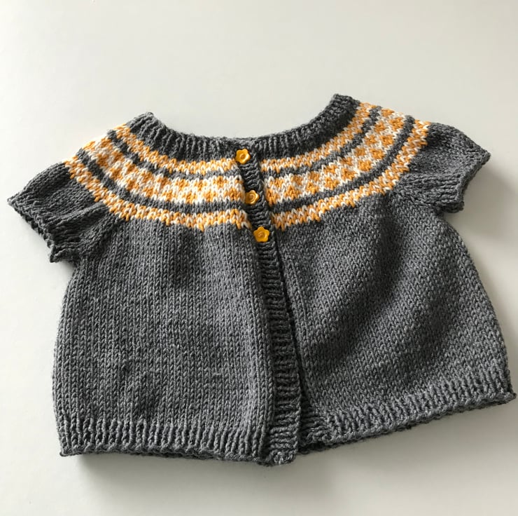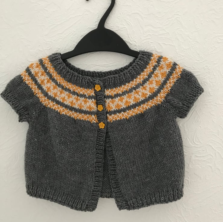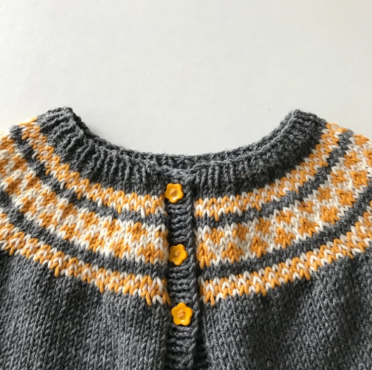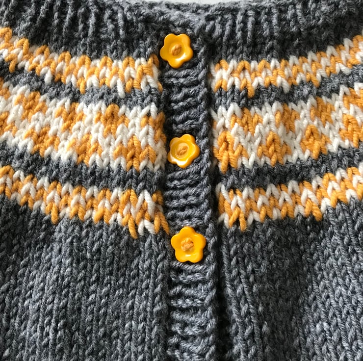 This cardigan is hand knitted in a lovely, soft wool and cotton yarn. The main body is a dark grey and the fair isle yoke is cream and golden yellow. It fastens at the top with three yellow flower shaped buttons to match.