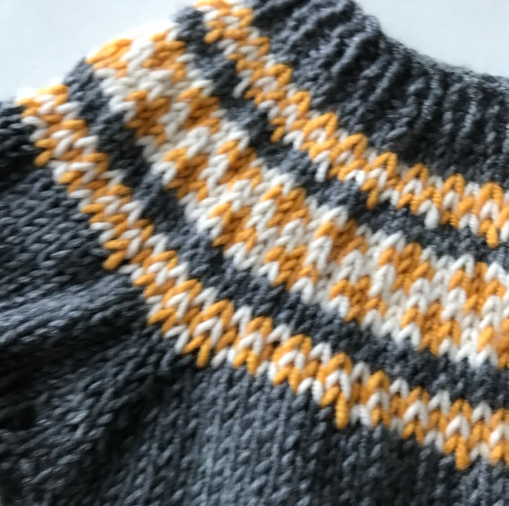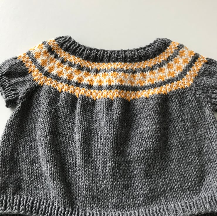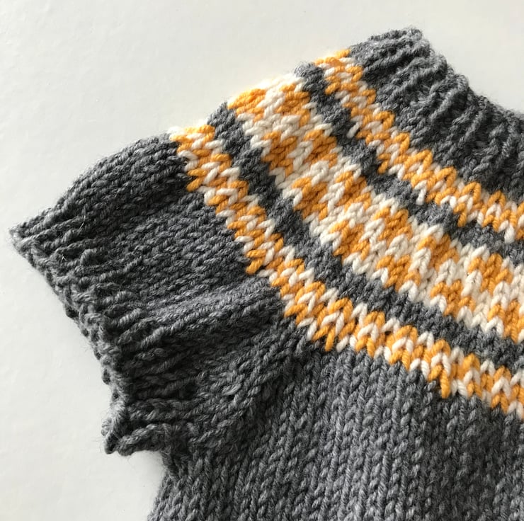 The bright fair isle yoke of the cardigan against the dark grey attracted me to knit this cardigan in the colours illustrated on the pattern. It was a bit of a challenge as the yarn has been discontinued ( a shame because it is gorgeous) and I had to source different shops. Well worth it though as the finished cardigan lives up to the pattern name of sunshine yellow.