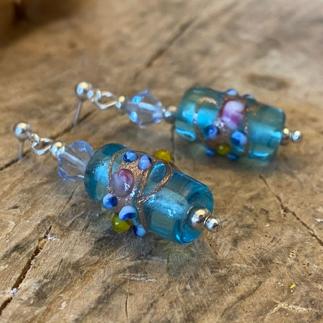 It's stopped raining, and outside is full of golden light, the garden is blooming and the blooms bright, so inspiration struck and I have been making flower jewellery. The beautiful beads have little pink roses and golden threads, pink gives the flowers warmth, whilst the silver post and backing disc is gentle on even the most sensitive skin.