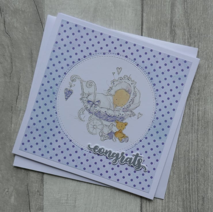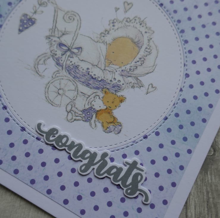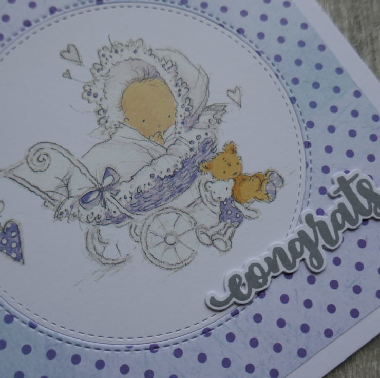A piece of lilac and purple spot paper has been attached to the card leaving a white border around the edge. A stitched circle has been die cut from the front and the cute Lili of the Valley precoloured baby image has been inlaid into the aperture. 'congrats' has been stamped in grey ink, die cut and attached to the card.