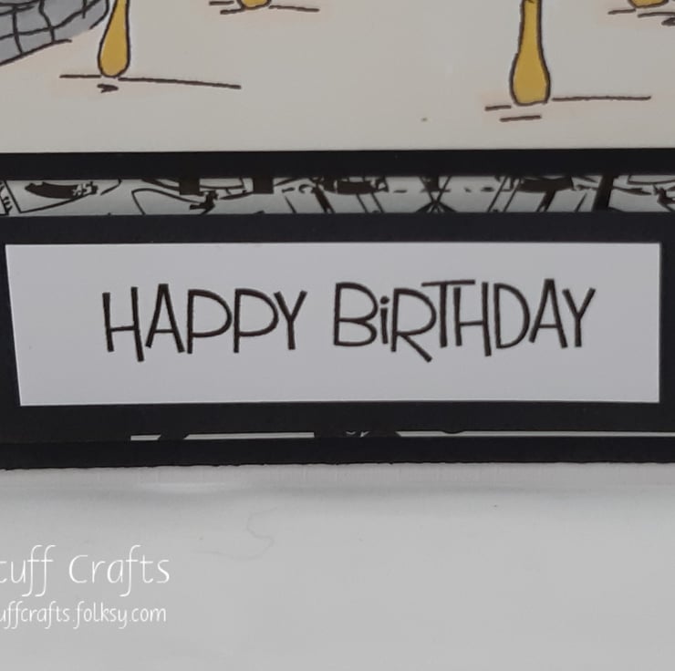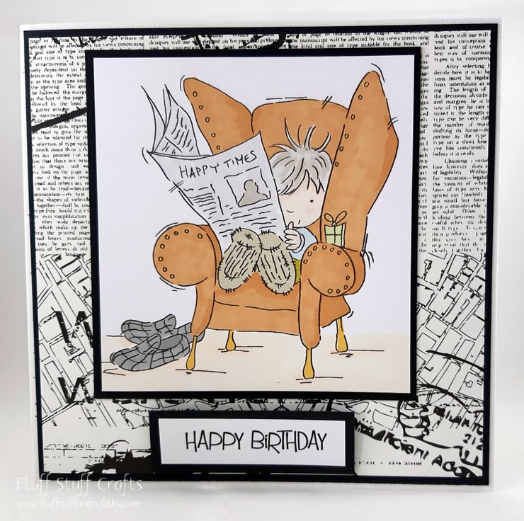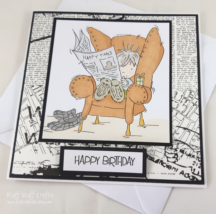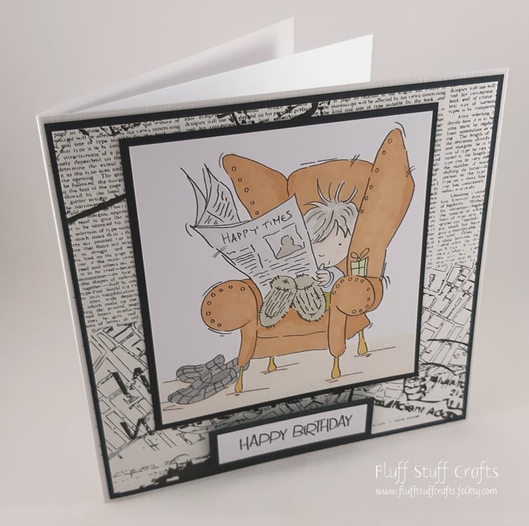 Square birthday card featuring a hand coloured image of someone sitting in their armchair reading the newspaper. The image and sentiment 'Happy Birthday' have been framed in black card, over a newsprint patterned background.