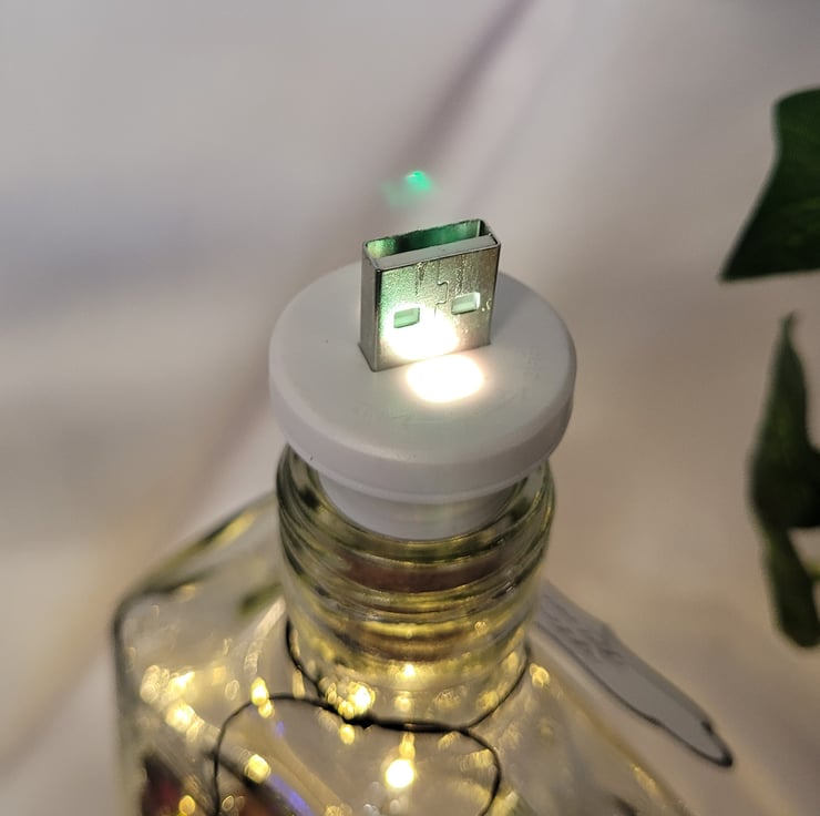 Lit by a warm white rechargeable 15 LED light string with colour changing jewel. It switches on by twisting the jewel, and recharges via USB by pulling off the jewel. All bottles are upcycled.