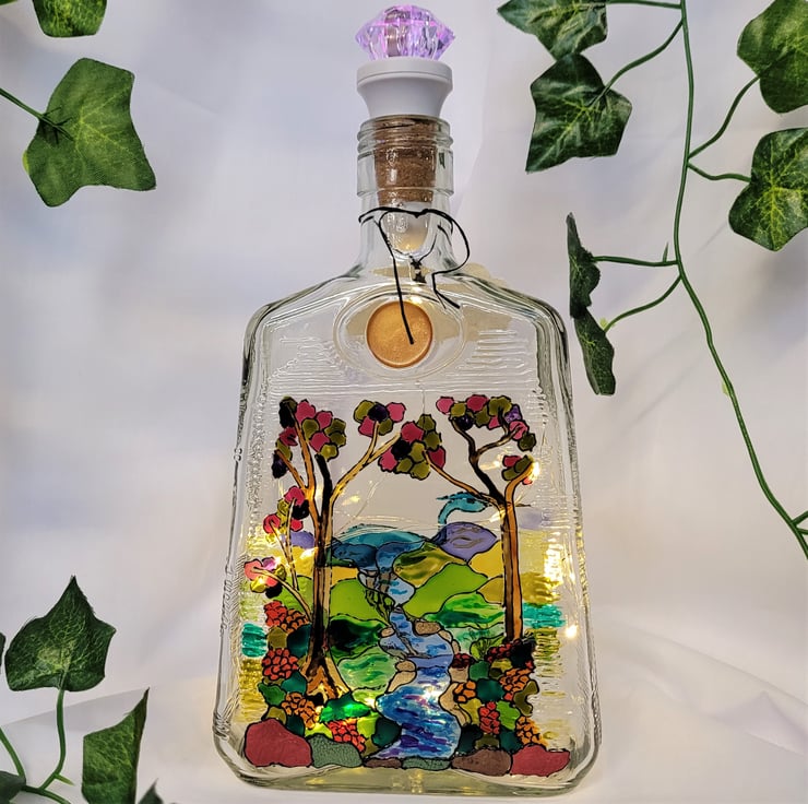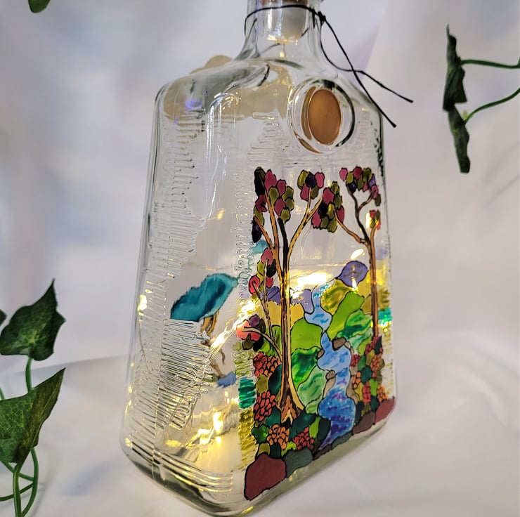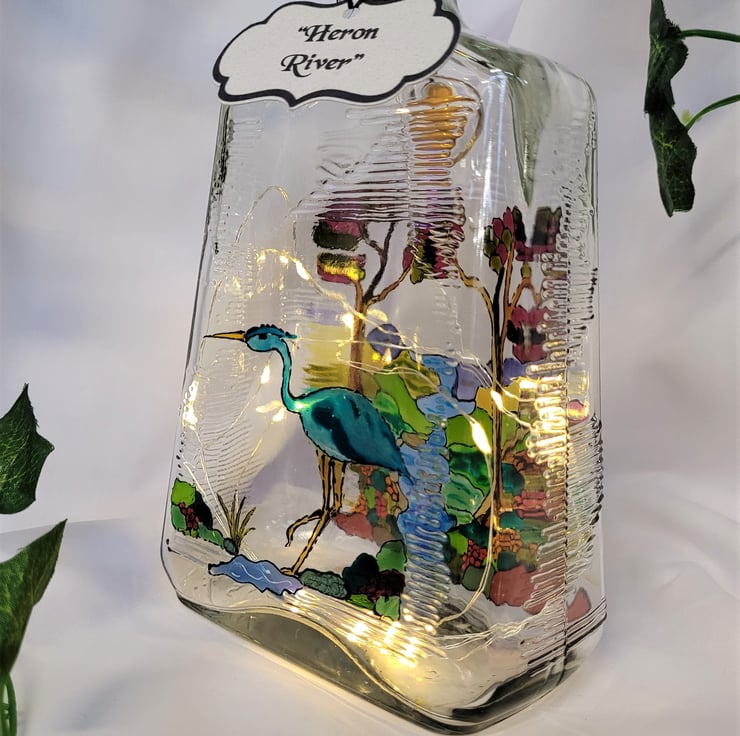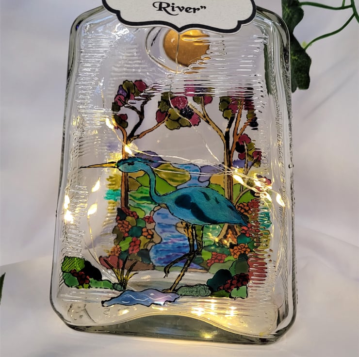Disarrono bottle, with an Oriental design of trees framing a river, and on the reverse a heron standing in a pool. This can be used as a lamp during the night, or a 3D suncatcher during the day.