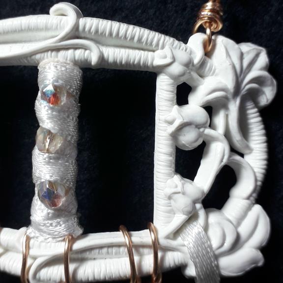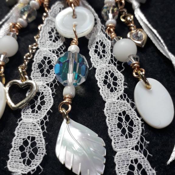 To the buckle I have added 3 dangles made up with aurora borealis crystal beads, frosted glass beads, shell ovals and a vintage mother of pearl button, I have also added 2 heart charms and ribbon and lace, the centre bar of the buckle is wrapped with ribbon and has 3 smaller crystal beads attached.