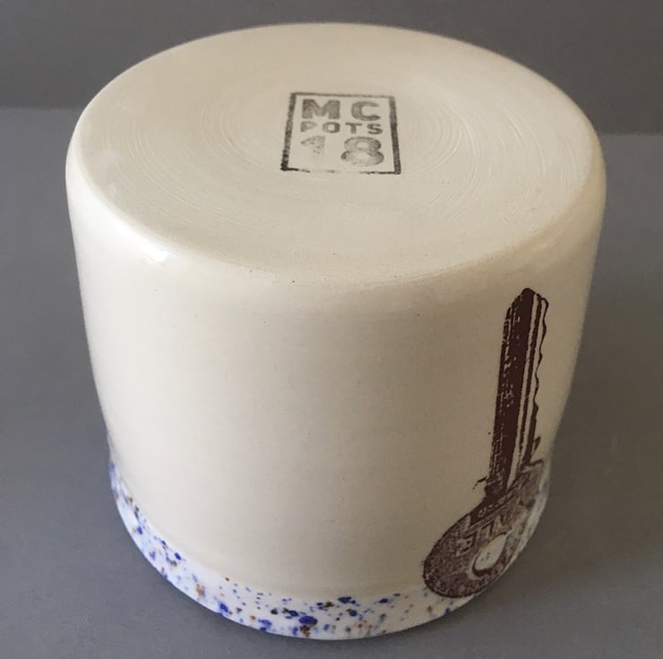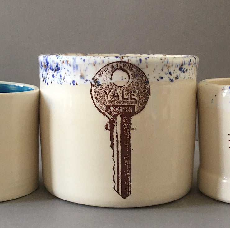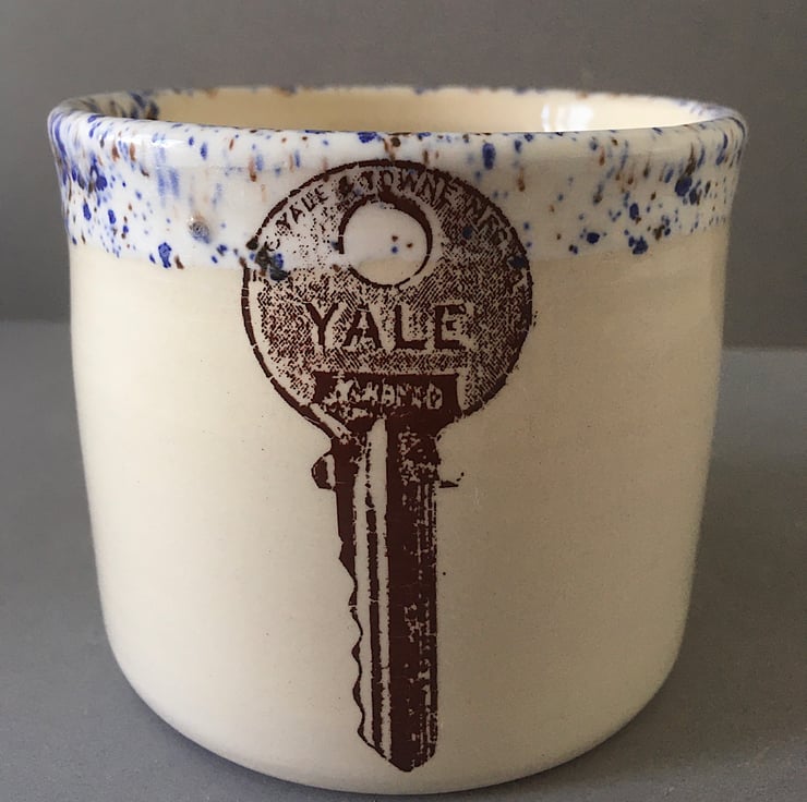 Handmade on my pottery wheel, fired in ‘Kev the kiln’ Decals also made at home..with an obsession of graphics and weirdly, old keys.