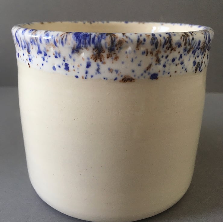 A super cutie for all your key needs! Well, truth be told, it could be used for anything you want. This little fella has a creamy earthenware body with a speckled blue glaze rim.
