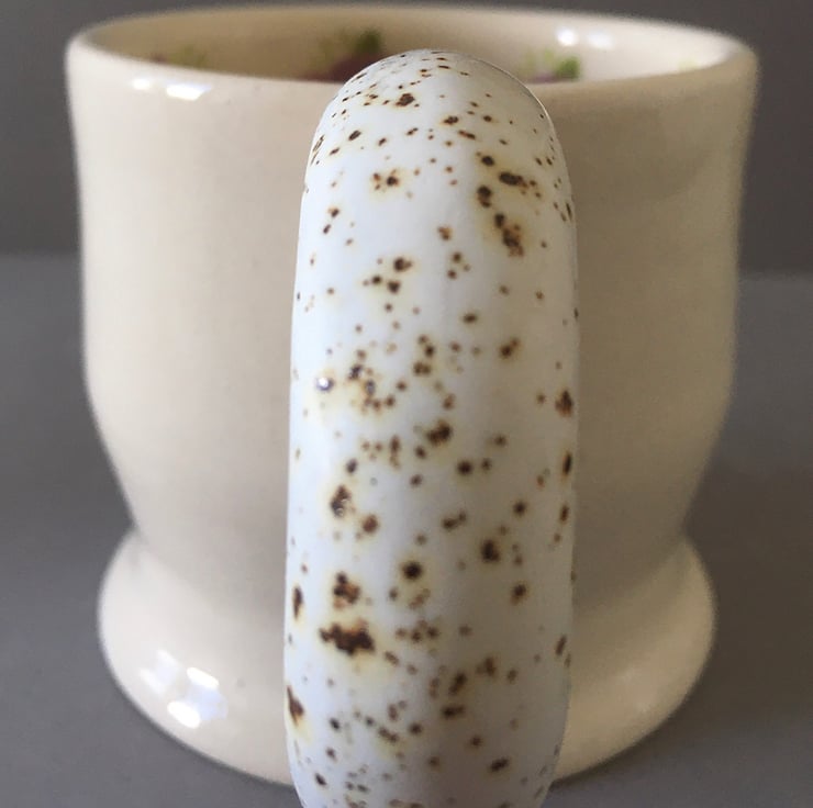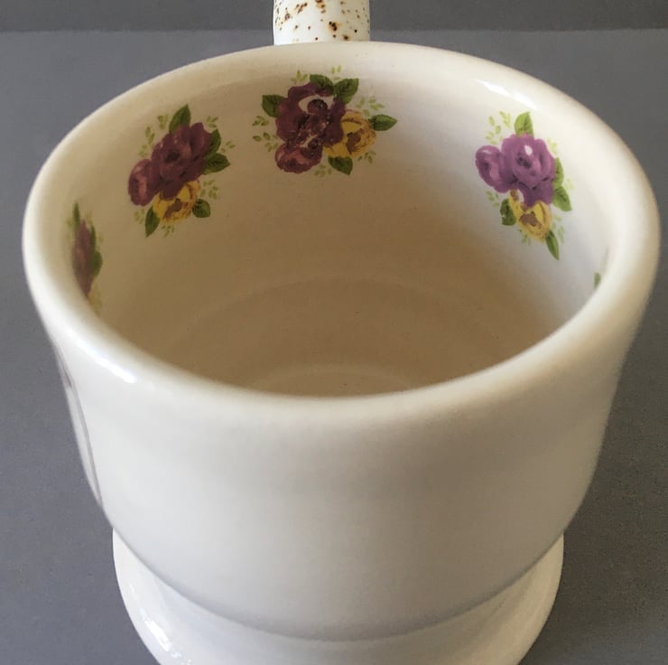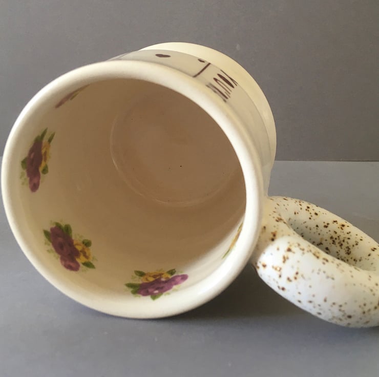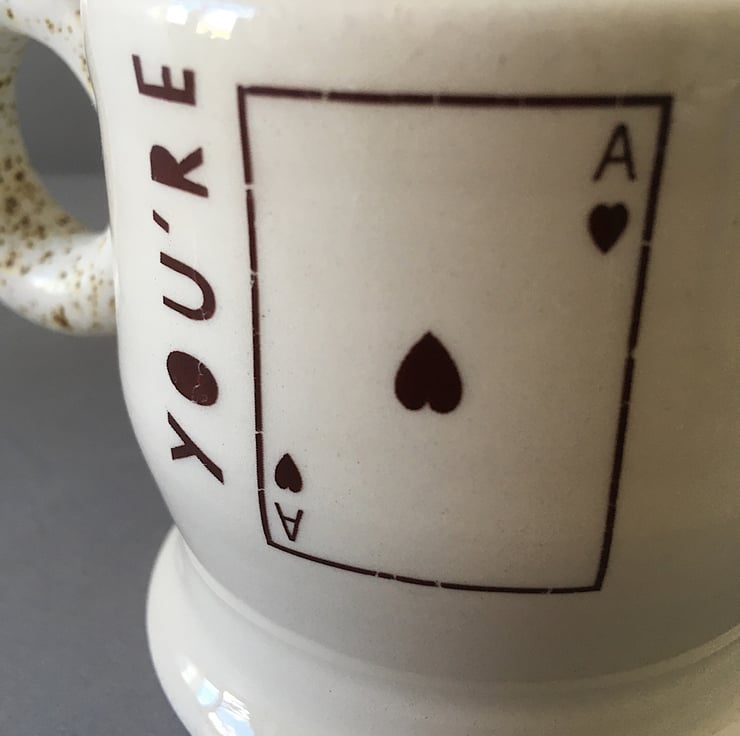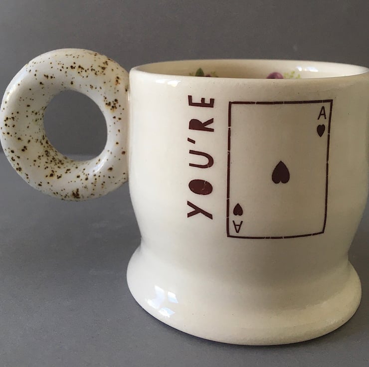 Hand thrown white/cream earthenware cup. This hand made cup has a speckled, matt glazed donut handle! A handmade decal with simple font saying “You’re” and an Ace of hearts playing card. Small vintage florals travel inside the rim of the cup.
