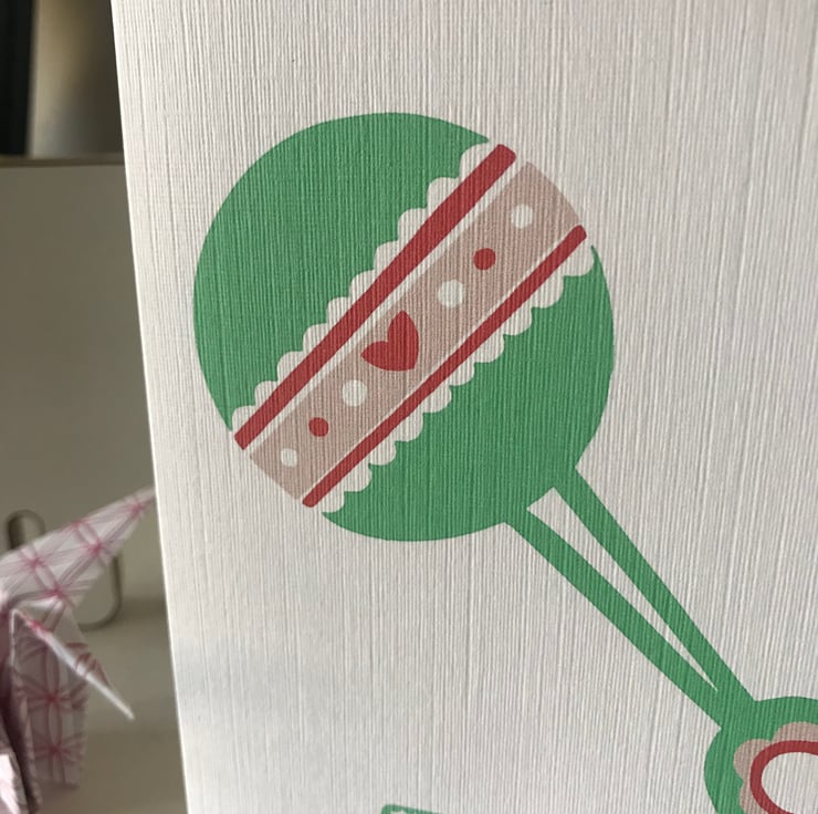 My designs are inspired by Scandinavian print and mid century patterns and colour but but interpreted in a modern way. This little rattle card was designed as part of a range inspired by the birth of my friends very special daughter, Elke. I wanted to create some baby designs for her that would have a vintage style but with a modern application for this very modern little lady.