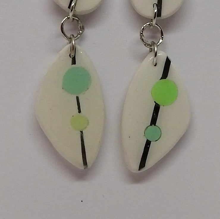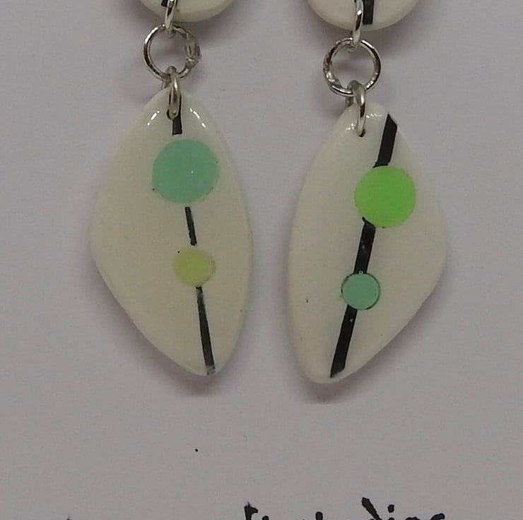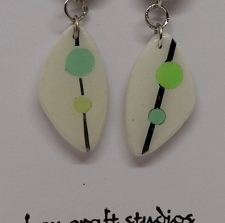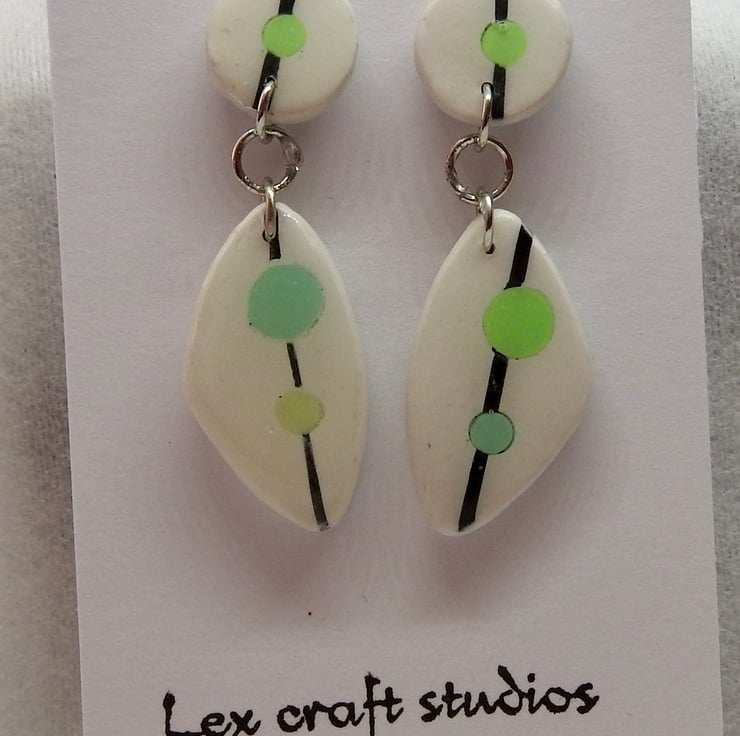 A delightful pair of white ceramic earrings with green spots , I really enjoyed making this set and love how fresh it looks . Finished in bio resin for strength and shine. Comes supplied in a black velvet pouch.