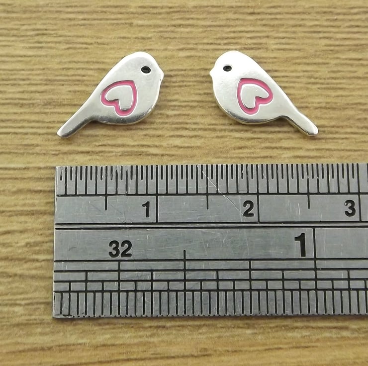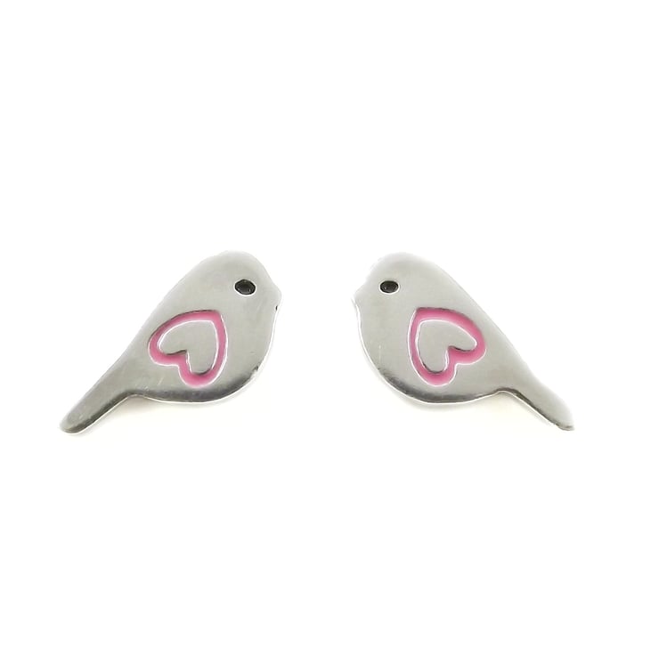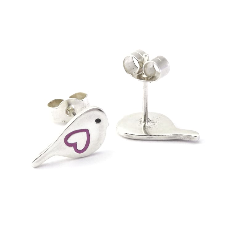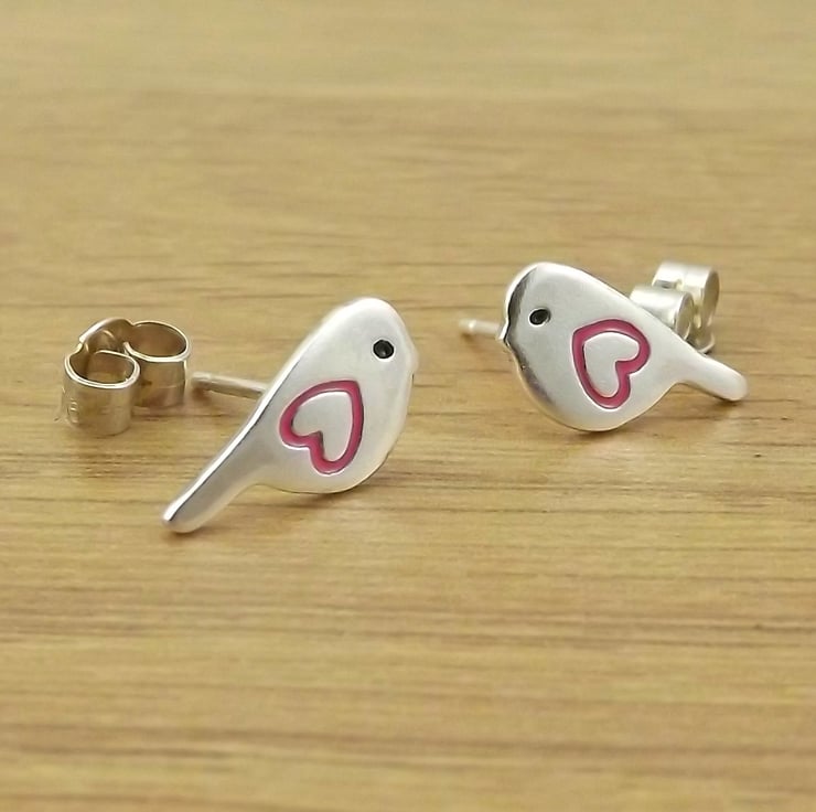 These handmade bird stud earrings have been lovingly handcrafted by in the UK. They are made from sterling silver sheet and are etched before being cut by hand, the edges are then smoothed using files and emery paper before the earrings are carefully given there shape using a punch and hammer. 11mm ear pins are then soldered onto the back. Coloured resin based enamels are added to the etched areas and then the earrings are polished.