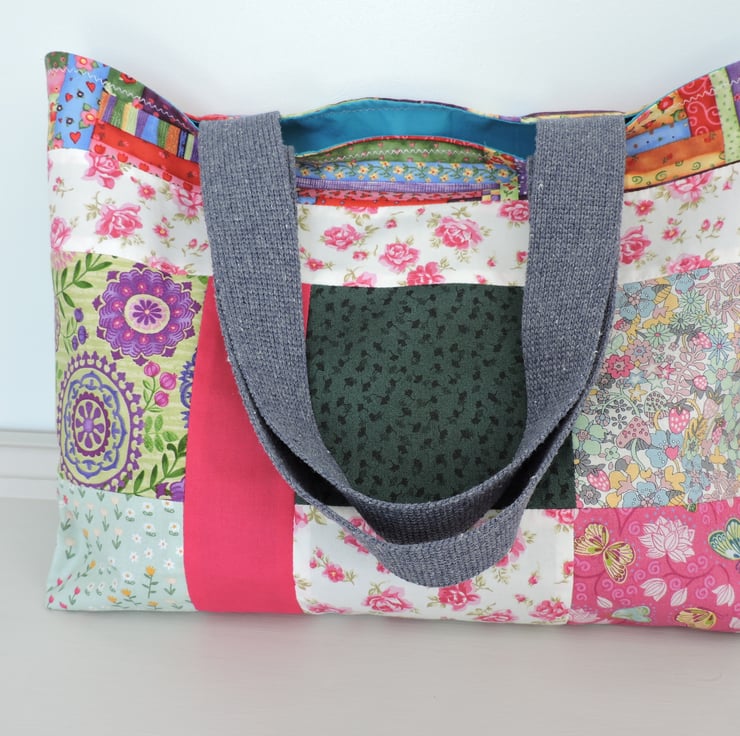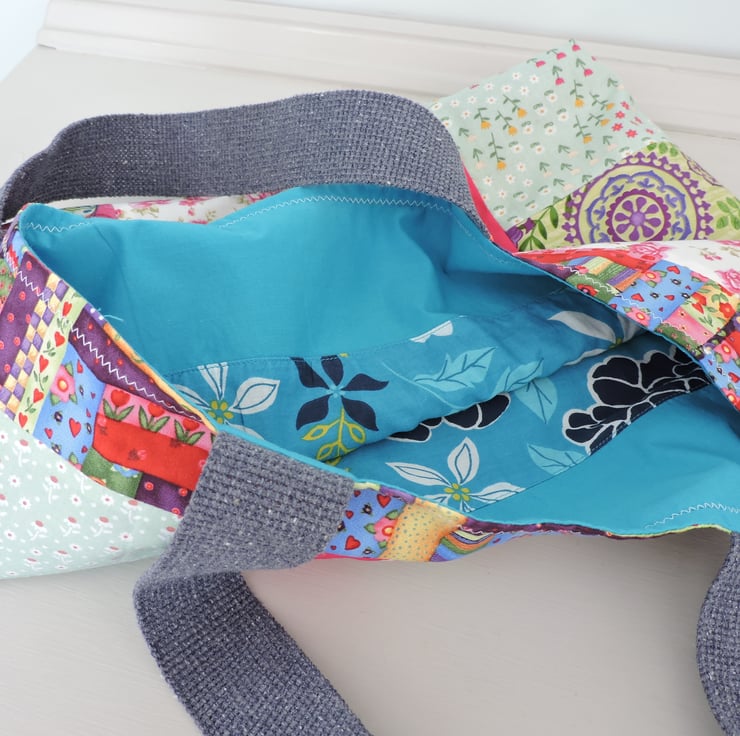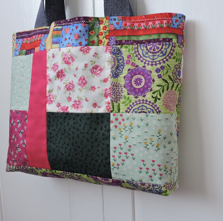 SALE This pretty rainbow coloured patchwork tote bag, shopping bag, book bag, craft bag has been made with off cuts of cotton fabrics. Assorted patterned fabrics in purple, white, pink, and green. It is fully lined with a vibrant blue and white floral cotton fabric and has a squared off bottom. This bag folds easily to fit in a pocket, bag or suitcase making it the perfect resuable tote bag.