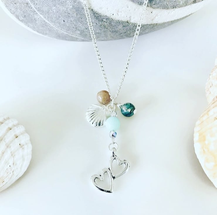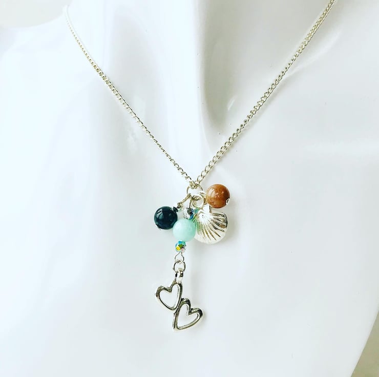 Pretty ‘love our ocean’ necklace, created using silver plated heart and shell charms surrounded by semi precious gemstone beads in aqua blue, sandy brown and moss green.