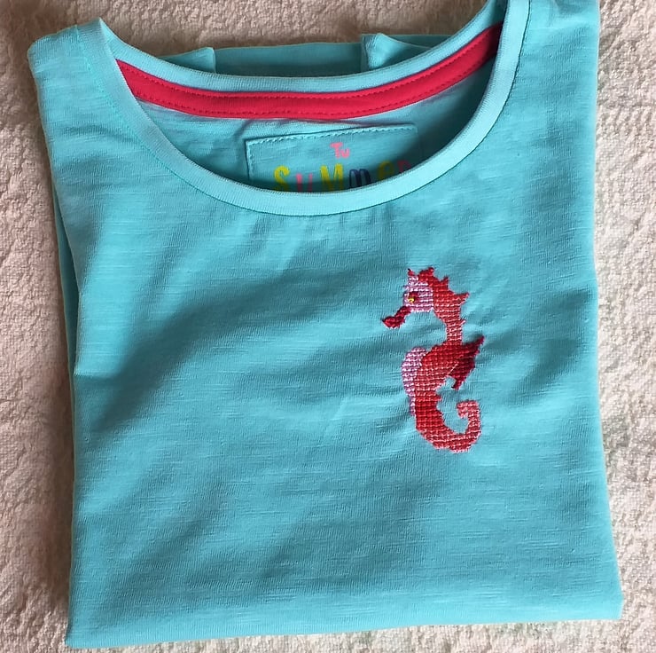 The watery appearance of this summery little shirt just asked for my seahorse, and the deep pink band at the back of the neck suggested the toning colours of the motif.