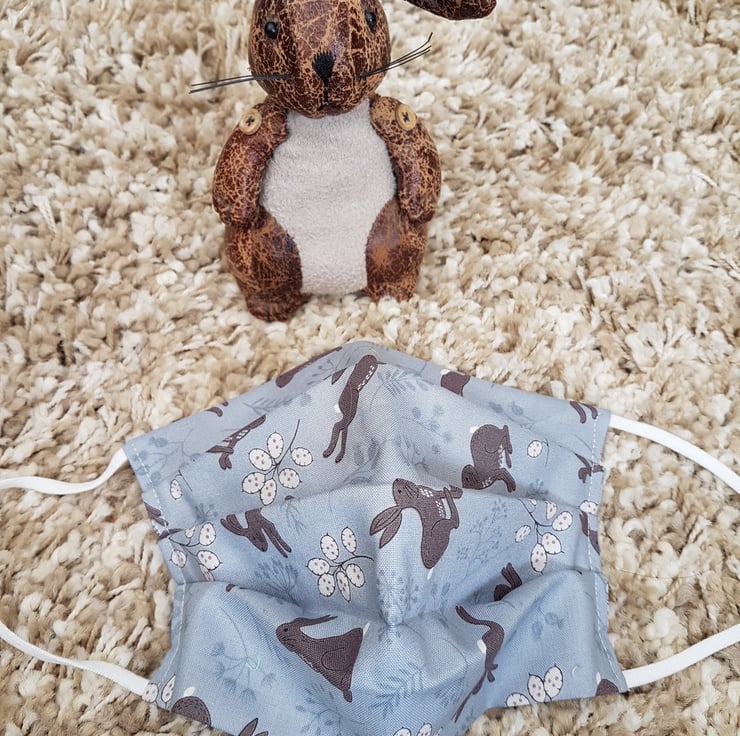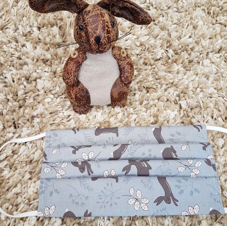 Adult face covering/mask made from a leaping rabbit print on grey cotton. The face mask is made with 2 layers of cotton forming an inner pocket for a filter (not included) and is fastened over the ears with 2 loops of elastic and a toggle adjuster.