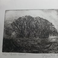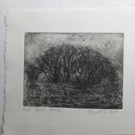 This drypoint etching measures approximately 3"x4" and was printed from a plexiglass plate, etched with fine etching tools using black Akua soy-based ink on Canaletto paper and painted with watercolour. It is number 2 in a variable limited edition of 20.