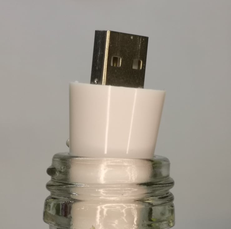 Lit by a warm white rechargeable 15LED light string with cork. It switches on by twisting the clear plastic at the base of the cork, and recharges via USB by pulling off the cork cover. All bottles are upcycled.