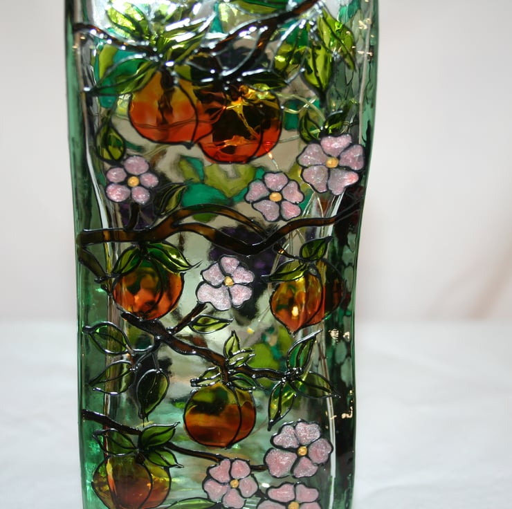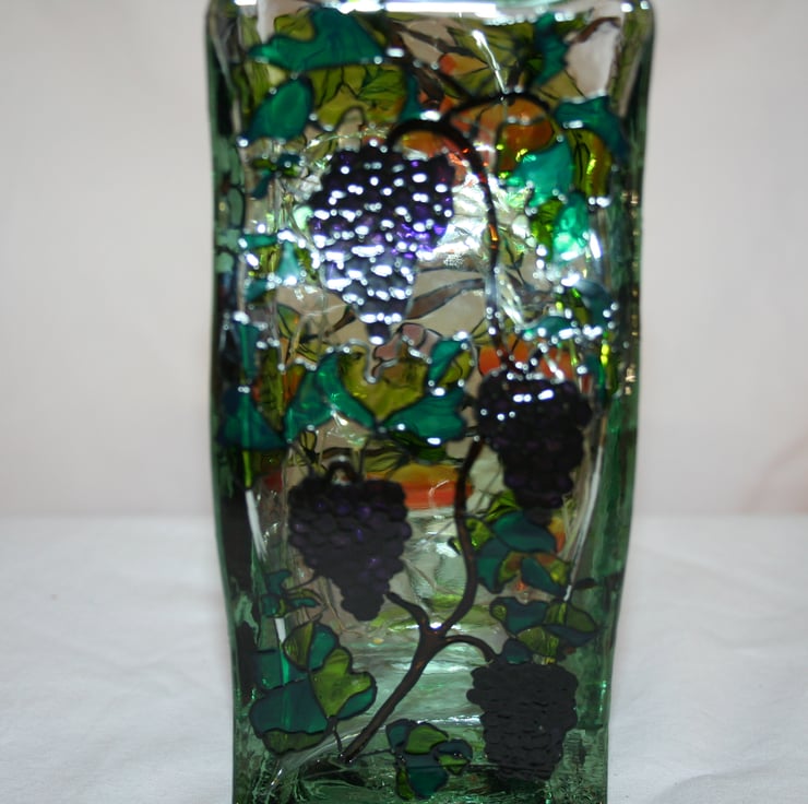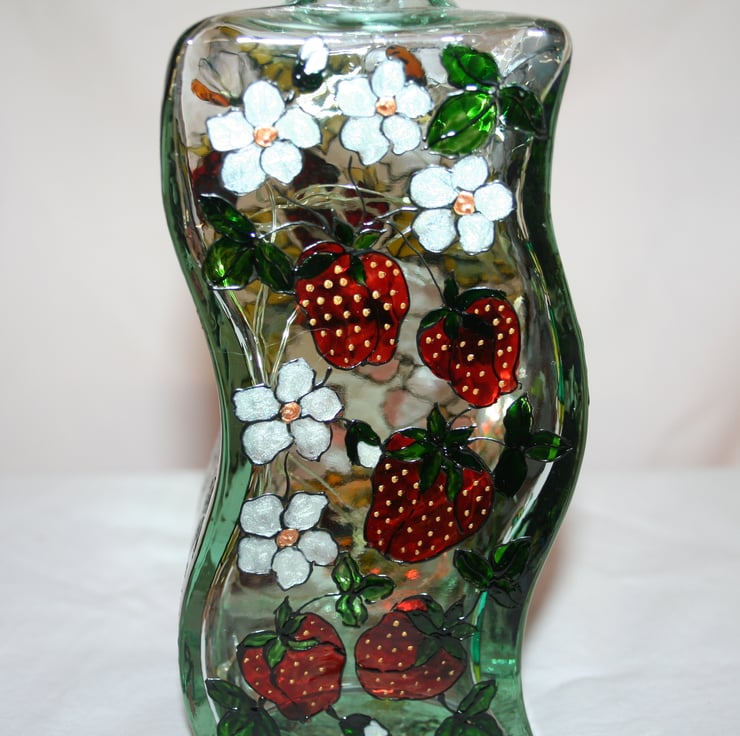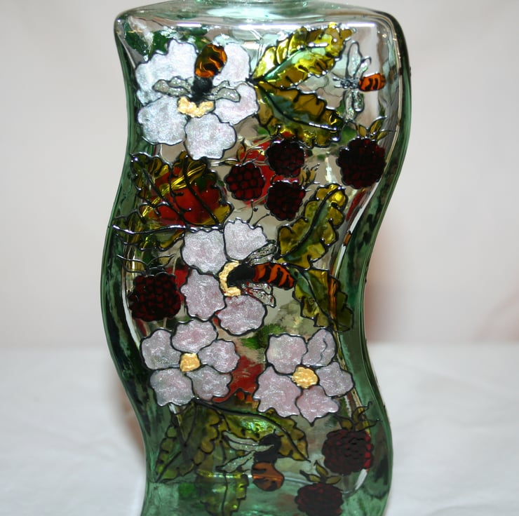 Wonderful heavy recycled glass bottle in an unusual wave shape. Decorated with raspberries, strawberries, peaches and grapes. A few bees just as an added bonus...