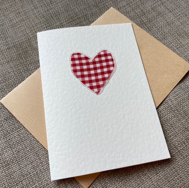 A pretty card made with a heart of red and white gingham check fabric with a glitter border. The card is ivory with a lovely 'hammered' texture and A6 in size with a coordinating envelope, packaged in a cellophane wrapper. Perfect for Valentine's Day, a wedding or an anniversary.