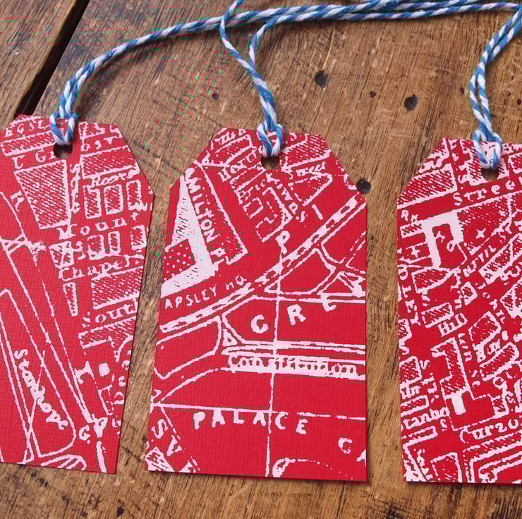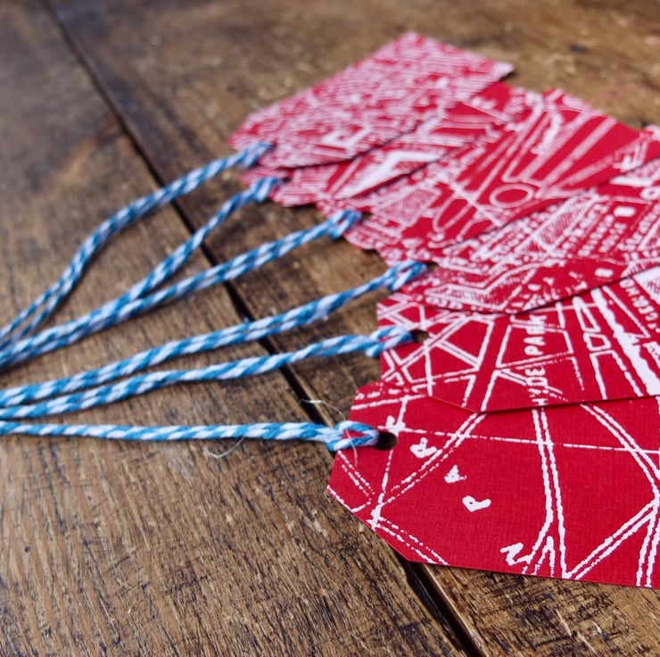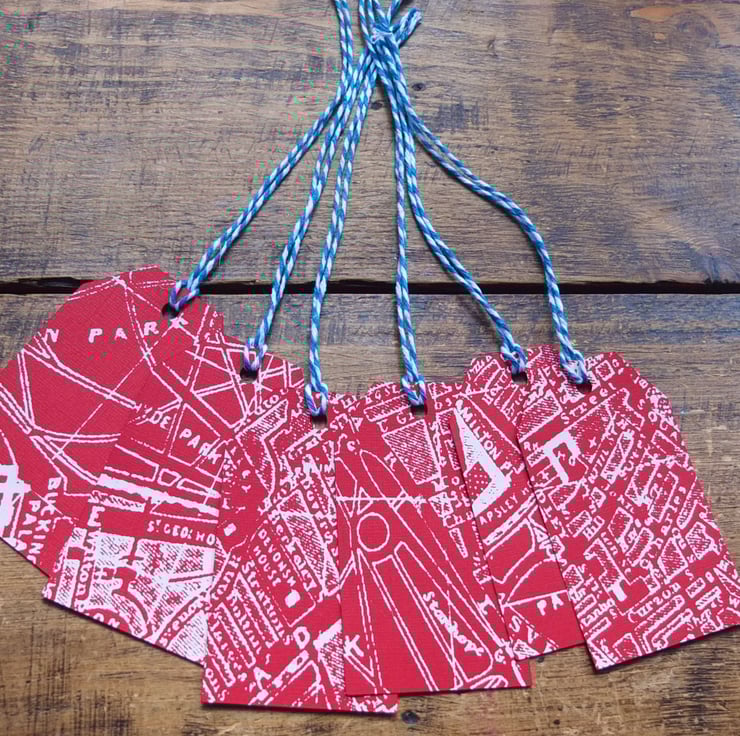 These gorgeous gift tags have a Vintage Map of London hand screen printed in white on red textured card, map shows Buckingham Palace Gardens, Green Park, Piccadilly, and surrounding streets, all topped off with blue and white striped string.