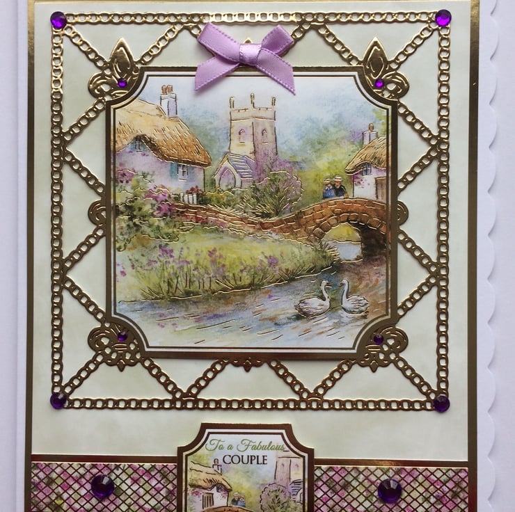 This is a really lovely luxury 3D handmade greeting card. The design is a thatched country cottage and village scene with a couple looking at two swans on the river. The 3D greeting has been gold foiled and says "To a Fabulous Couple" and another sentiment runs along the top which says "With Love and Best Wishes On Your Special Day".