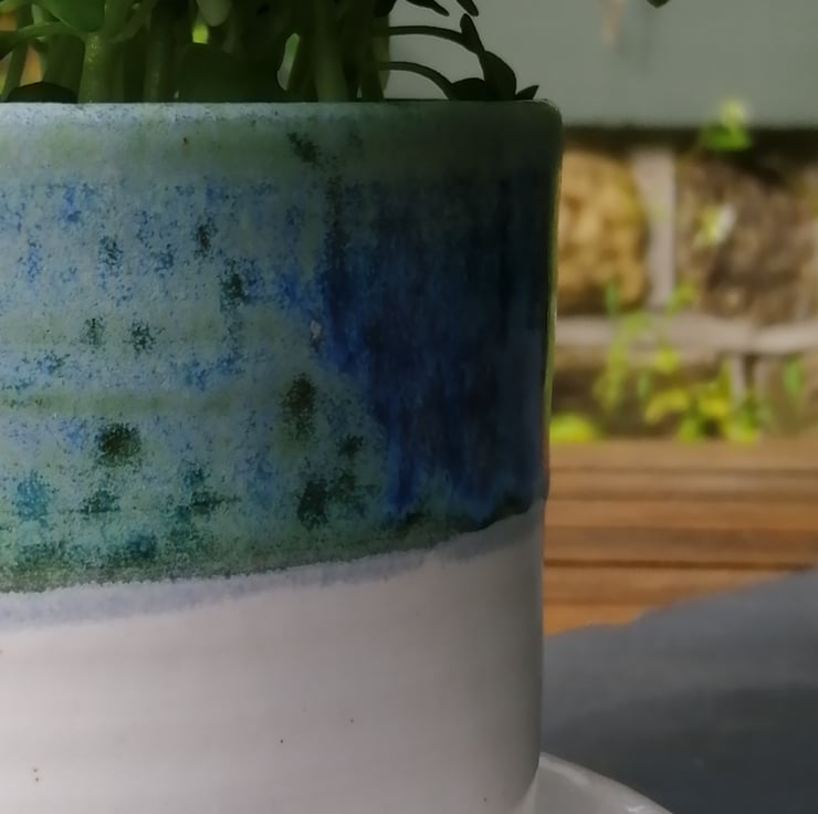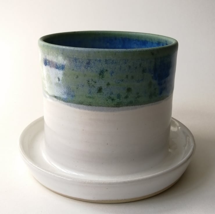 Handmade stoneware plant pot made on my potters wheel using a white clay body. The pot and plate are thrown as one piece, a technique that involves splitting the clay ball after centring. Once leather hard a drainage hole is added.