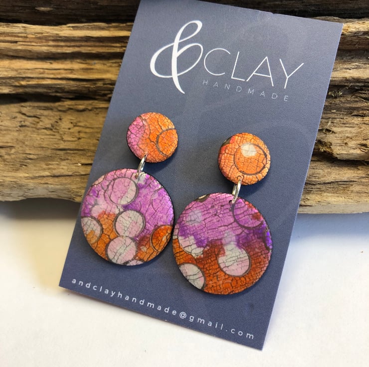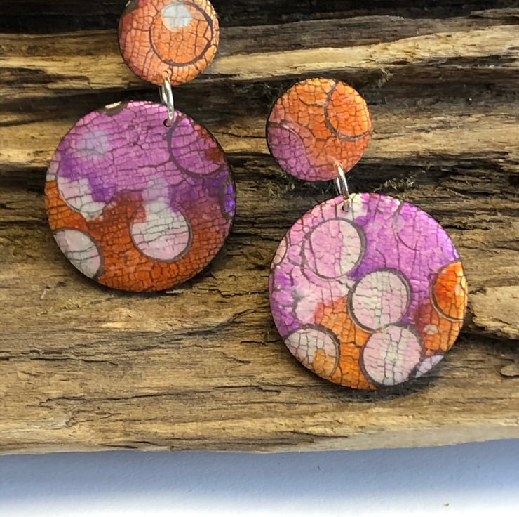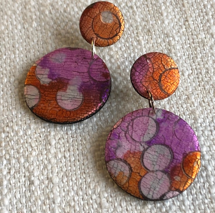 These pretty circular earrings were made by adding imitation silver leaf to a clay sheet and then enhancing the surface with alcohol inks, creating patterns and effects that are simply beautiful! Gorgeous shades of burnt orange, purple, pink, and silver give these earrings their rich surface pattern. Created from mixed media, they are unique, and one-of-a-kind. Using Premo Sculpey polymer clay, they are very light weight.