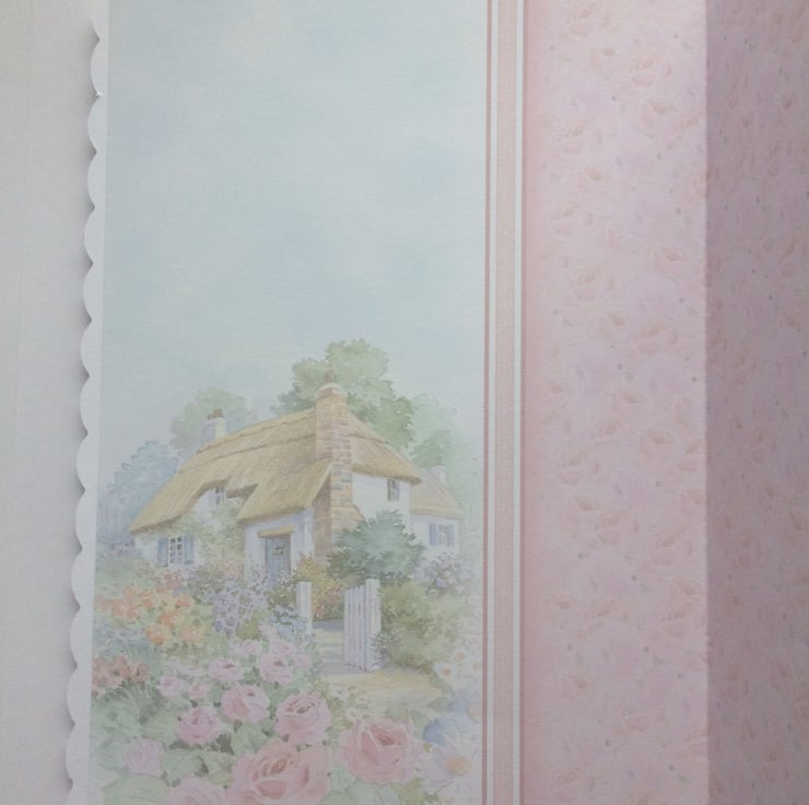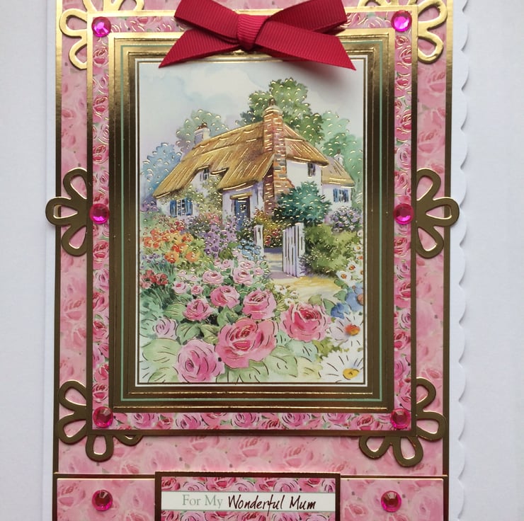 This is a lovely luxury 3D handmade greeting card to wish your Mum a happy birthday. The design is a country house with a thatched roof surrounded by a typical English country garden. The 3D greeting has been gold foiled and says "For My Wonderful Mum".