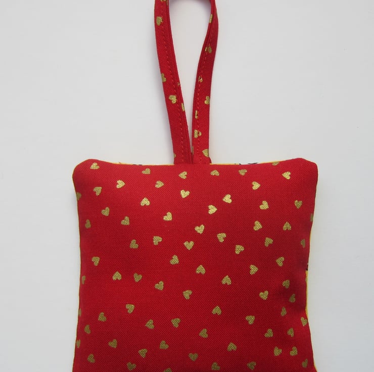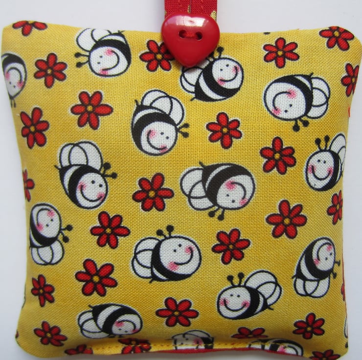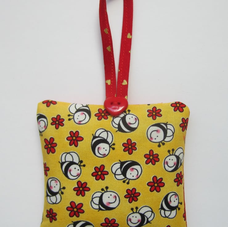 Lavender sachet made from a fabric featuring lots of little bees and red daisies on a yellow background and decorated with a red heart button. It is backed with a red and gold heart fabric and hangs with a matching loop.