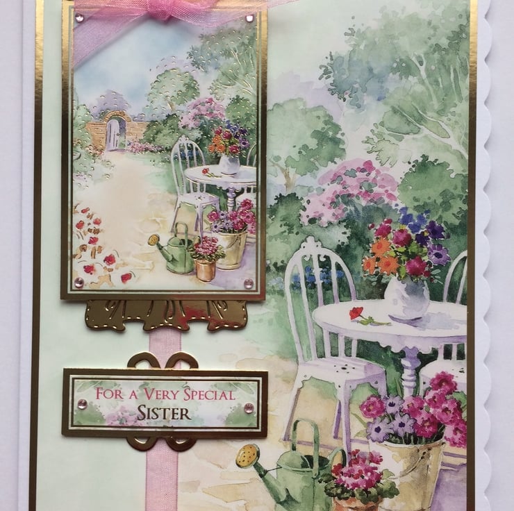 This is a lovely luxury 3D handmade greeting card to wish your Sister a happy birthday. The design is a country garden scene with beautiful flowers and traditional furniture. The 3D greeting has been gold foiled and says "For A Very Special Sister".