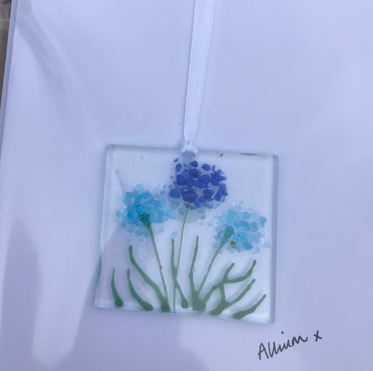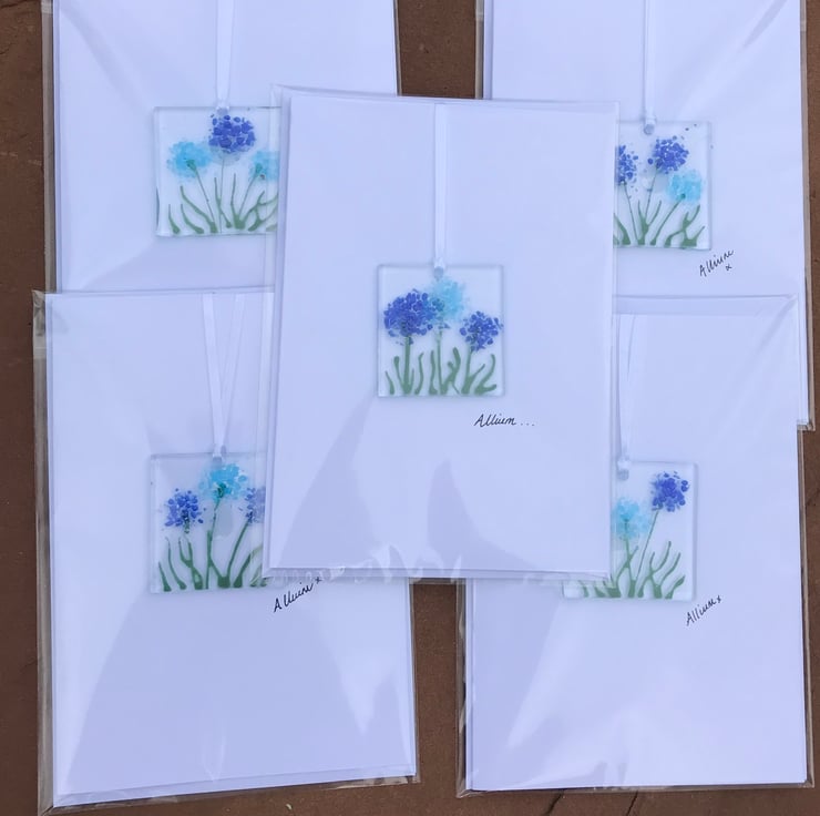 A blank white card and envelope in cellophane with a detachable fused glass hanging decoration which is drilled and strung with ribbon . It’s a card and a gift in one . Shiny and light reflective glass decoration of alliums .