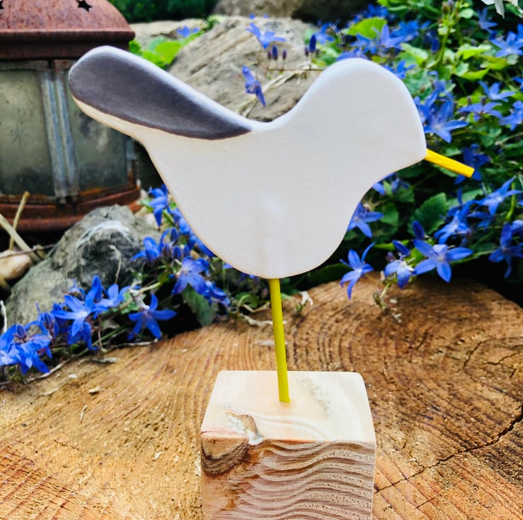 The seagull is unglazed matt white, accented with a grey glazed wing, bright yellow beak, and a bright yellow wire stem. It stands at around 14cm high.