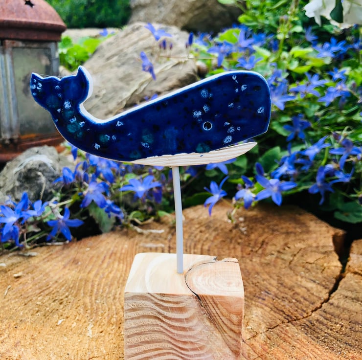 The whale is crystalline glazed on the top in bright blues and subtle green, blue and white spots. It stands at around 12cm high.
