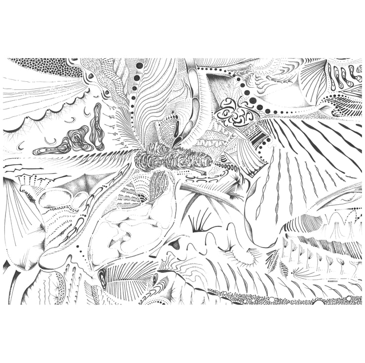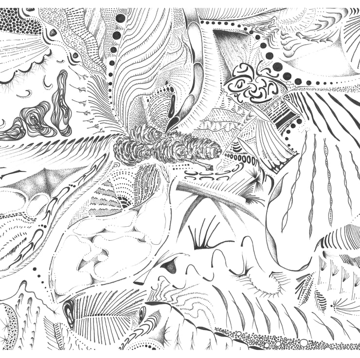 Entitled 'Composition No. 1', this abstract pen on paper drawing has a cluster of conifer cones at its centre, with an intricate series of patterns built up to fill its backdrop.
