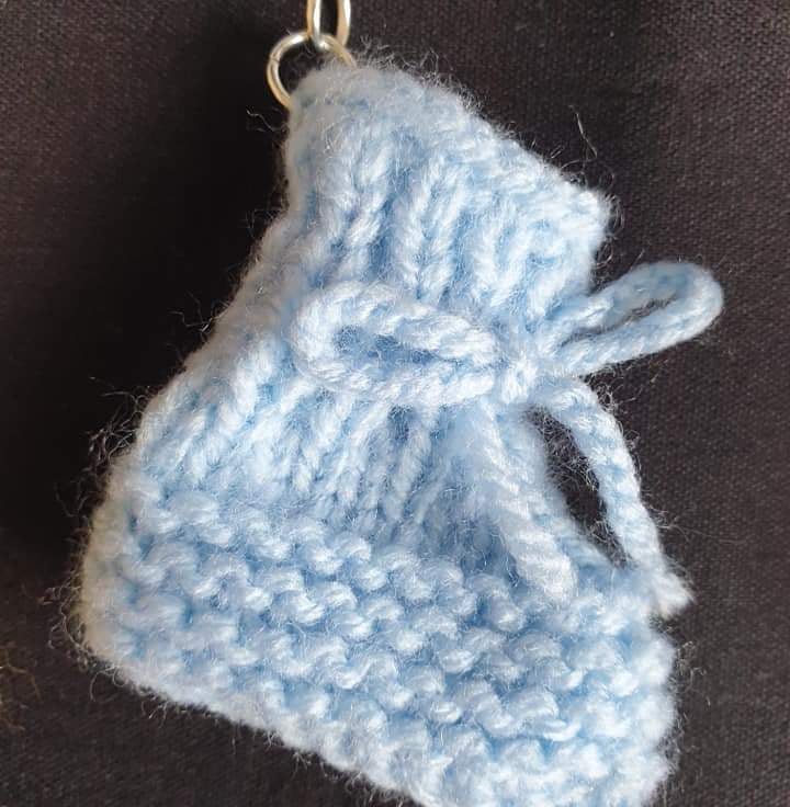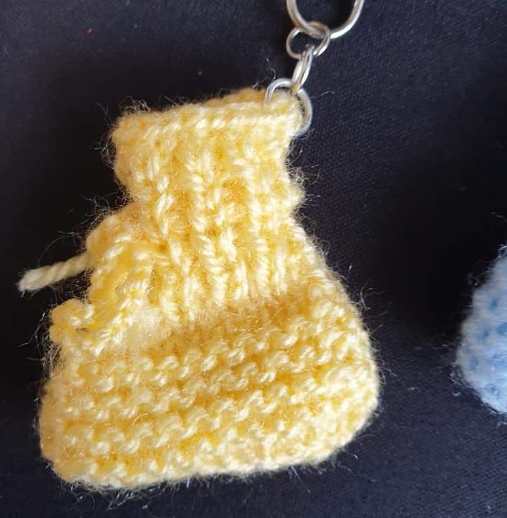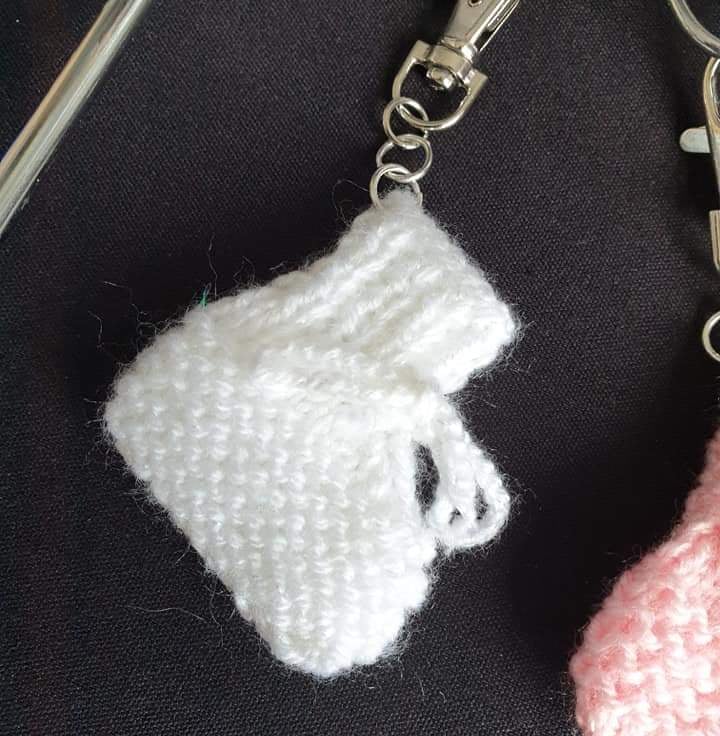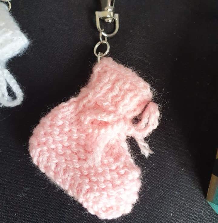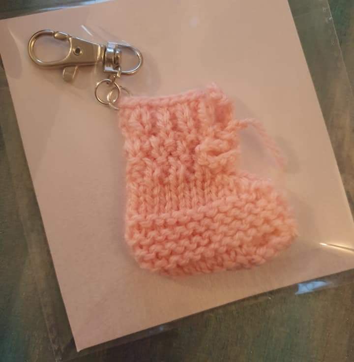 Beautiful hand knitted baby bootie keyringbor bag charm. Can be knitted it any colour ideal for a baby shower gift or for a new mum.