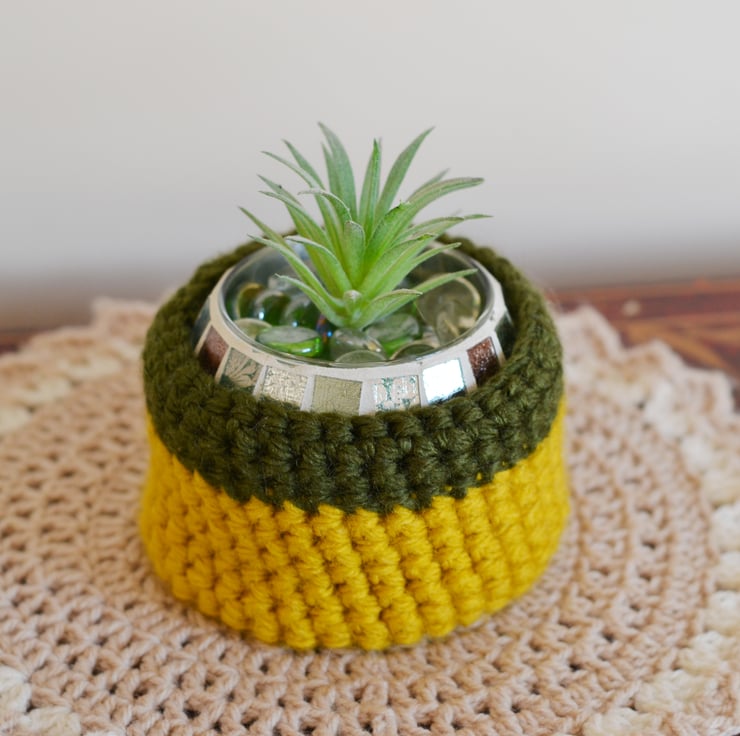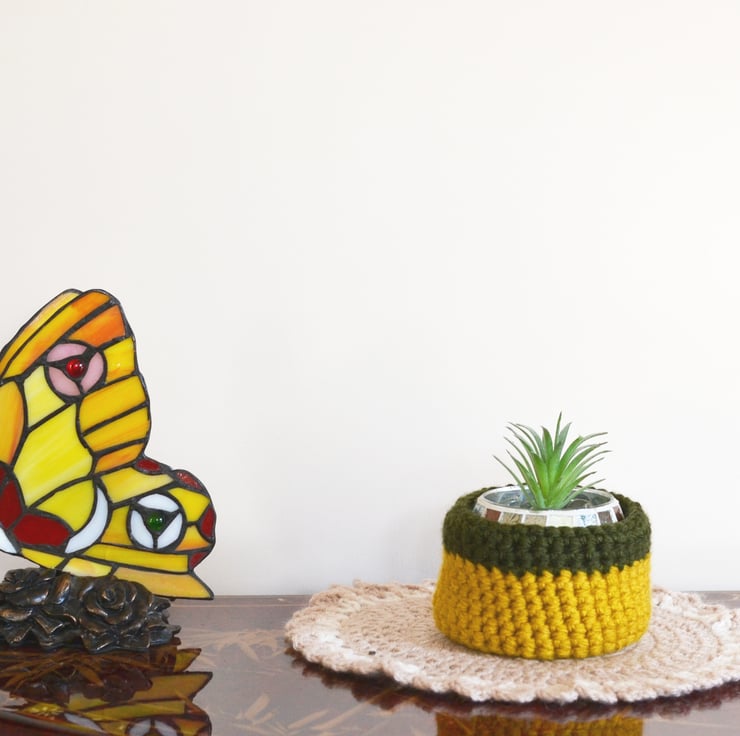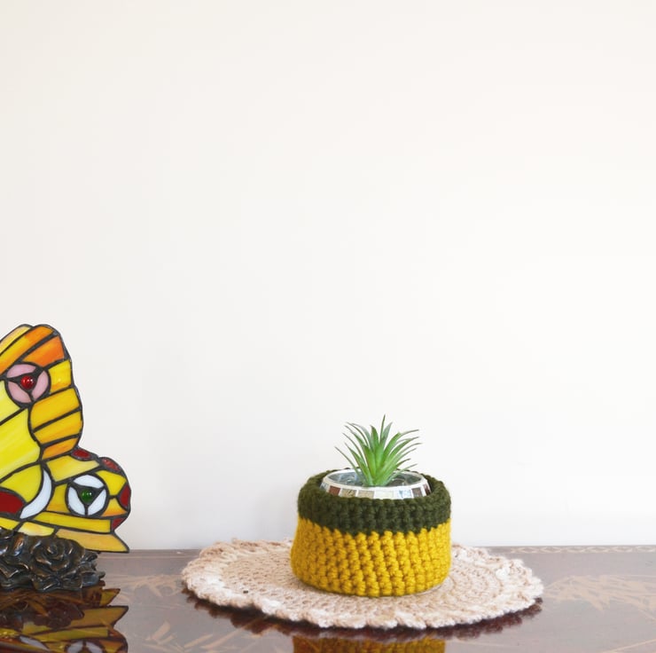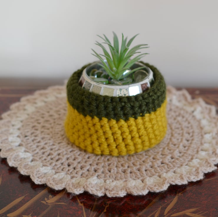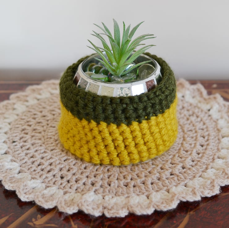 This hand crochet bowl is just right for keeping all of your little bits together or as a plant pot holder Made in 100% acrylic super chunky yarn in dark grey and khaki.