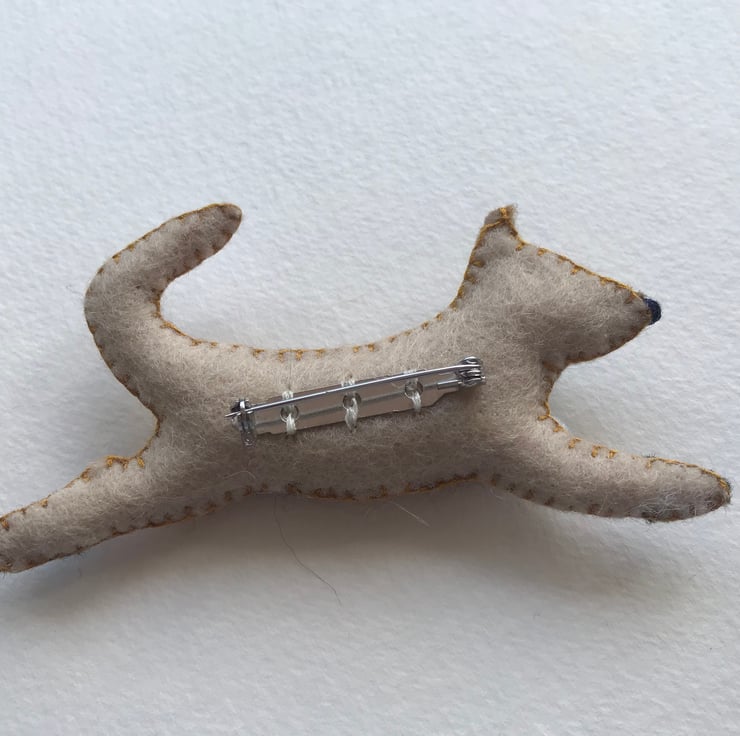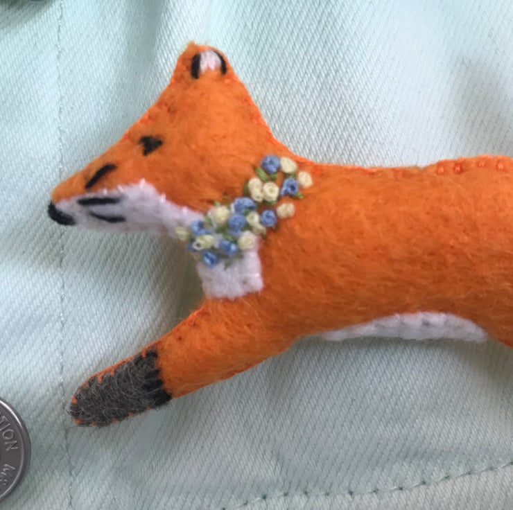 This orange fox brooch is designed and sewn by me. It would brighten up a jacket or bag. It's made from felt and is filled with toy stuffing. It measures 9cm long and is 6cm high. There is a blue and yellow embroidered flower garland, has a white throat and white tip of its tail. A safety brooch pin is sewn on the back.
